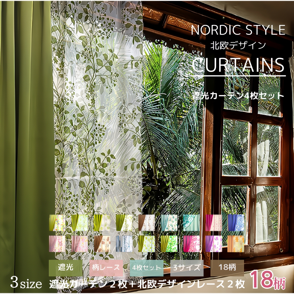 遮光性2枚+北欧風レース2枚の計4枚セットカーテン