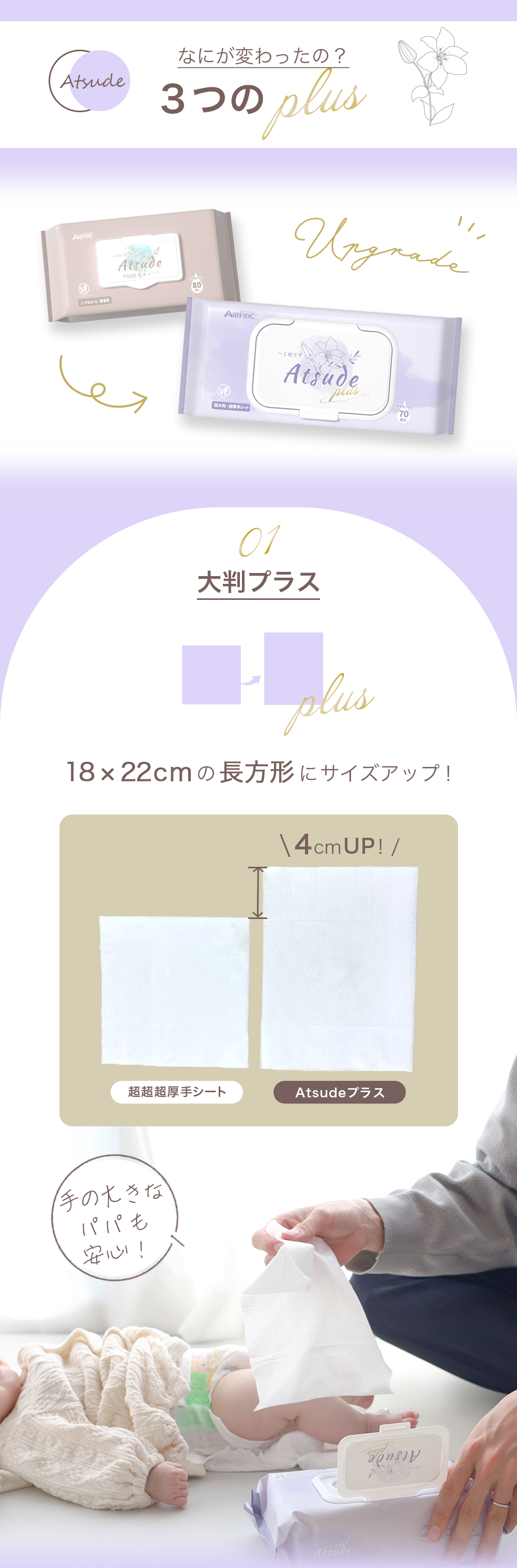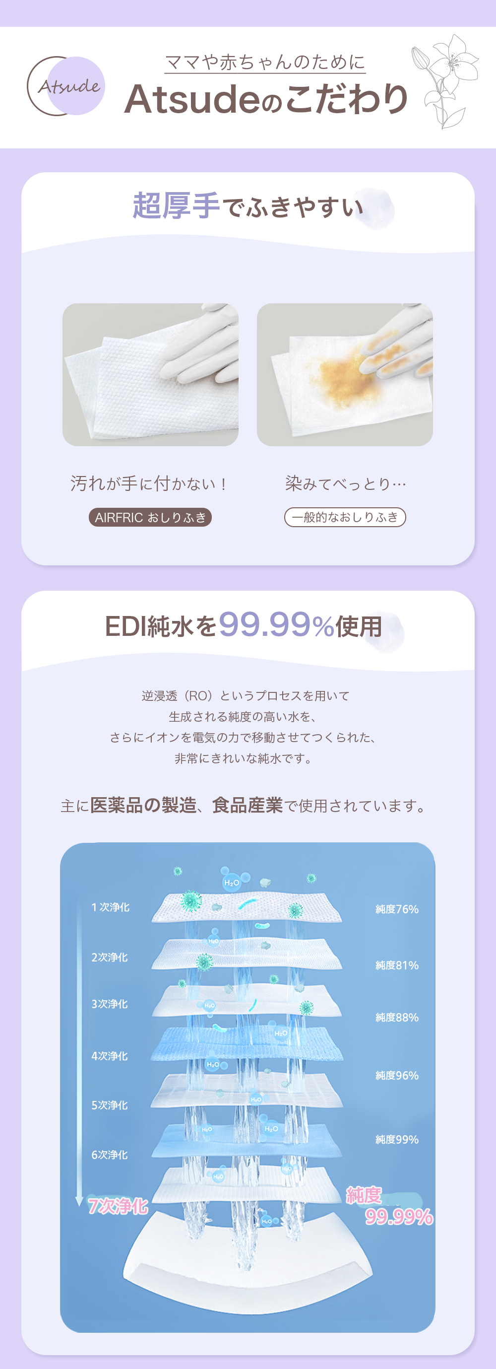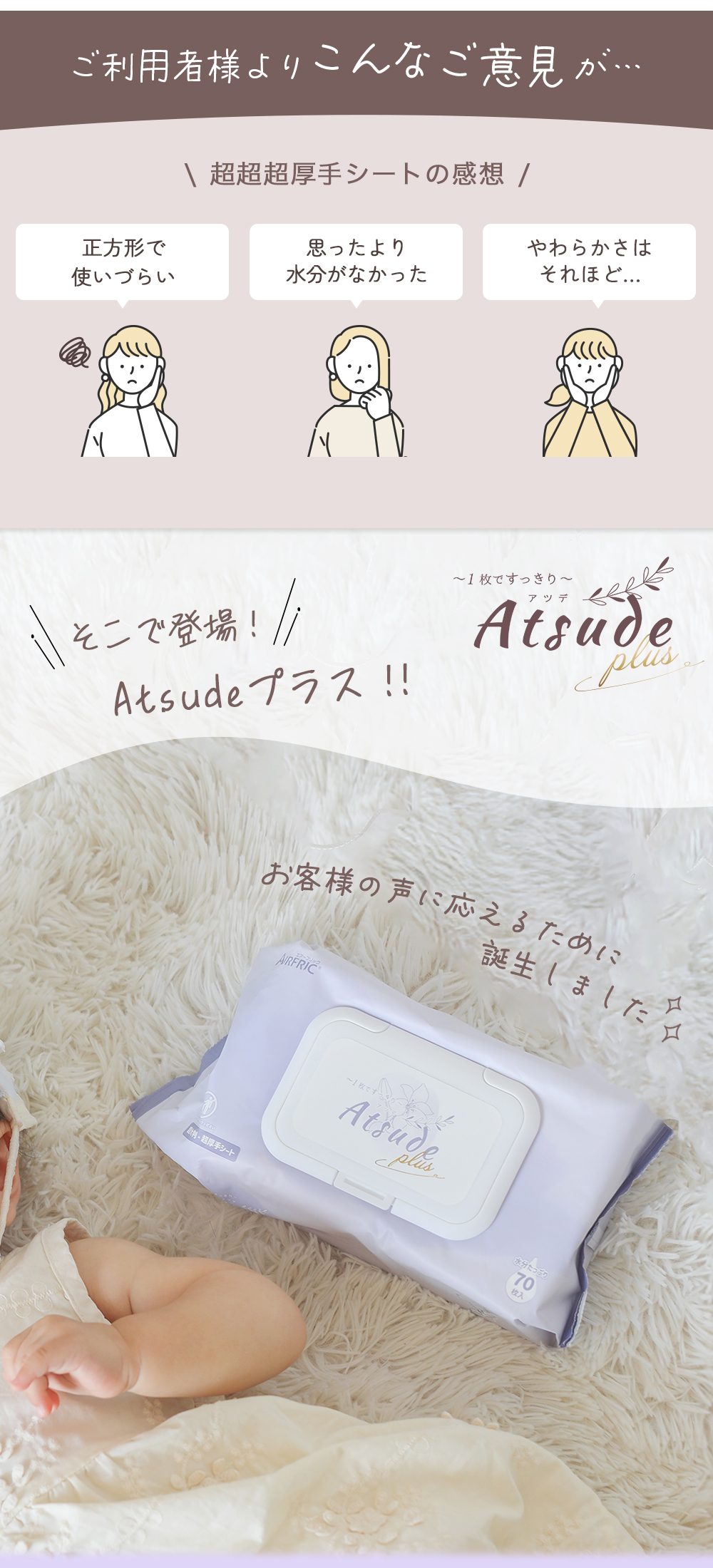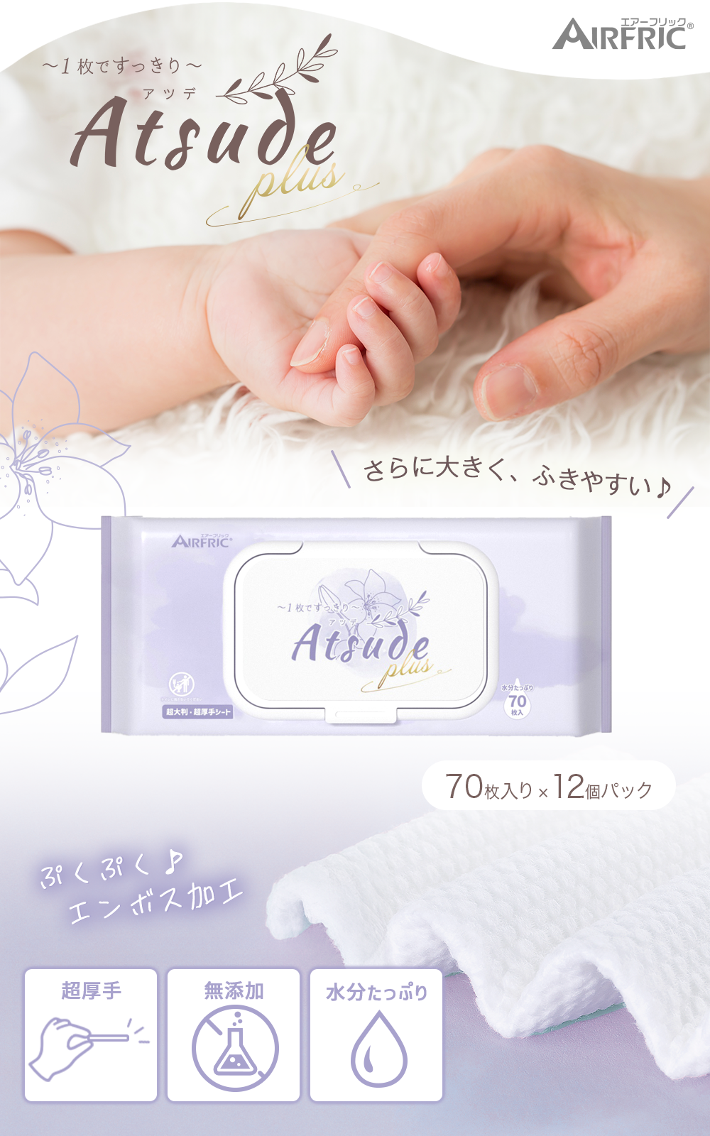 AIRFRIC おしりふき 厚手 無添加 無香料 ノンアルコール 蓋つき 大判 赤ちゃん ベビー 大容量 おしり拭き Atsude 70枚×12個 WT007