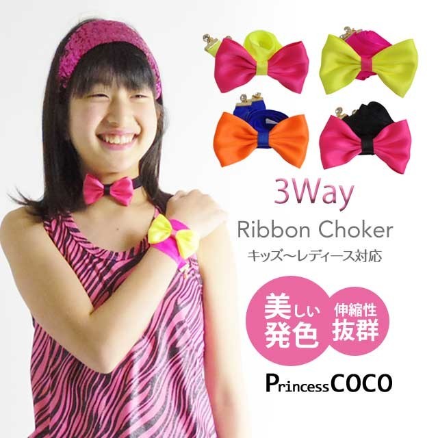 キッズ ダンス衣装 チョーカー ダンス アクセサリー 3Way リボン 子供 ジュニア ガールズ レディース フリーサイズ ダンス 小物 黒 蛍光
