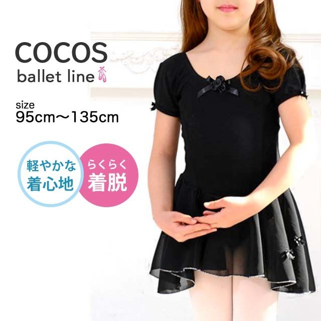 バレエ レオタード スカート付 子供 半袖 黒 リボンモチーフ キッズ 練習着 スカート付きレオタード