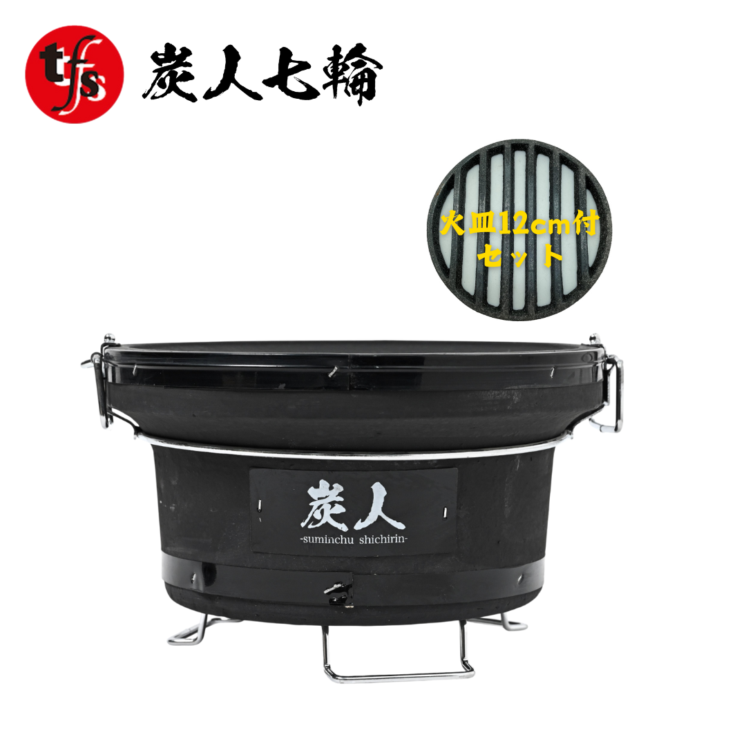 TFS 炭人 七輪 バーベキューコンロ 丸型 珪藻土 BBQ アウトドア 炭火焼き (黒+鋳物火皿平12cm)
