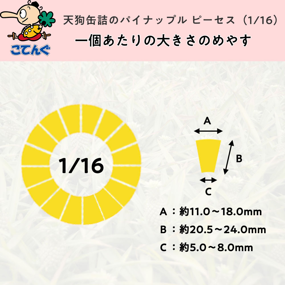 厚さ約1cmの輪切りのパイナップルを16個にカットした小片規格です。弧(外側)11〜18mm、弧(内側)5〜8mm、縦20.5〜24mmのパイナップルが、1缶に768〜960個入っています。酸味と甘みのバランスがよく、果汁がたっぷりなのが特徴です。常温で製造後3年間の保存が可能なので、いつでもお好きなときに南国の味がお楽しみいただけます。