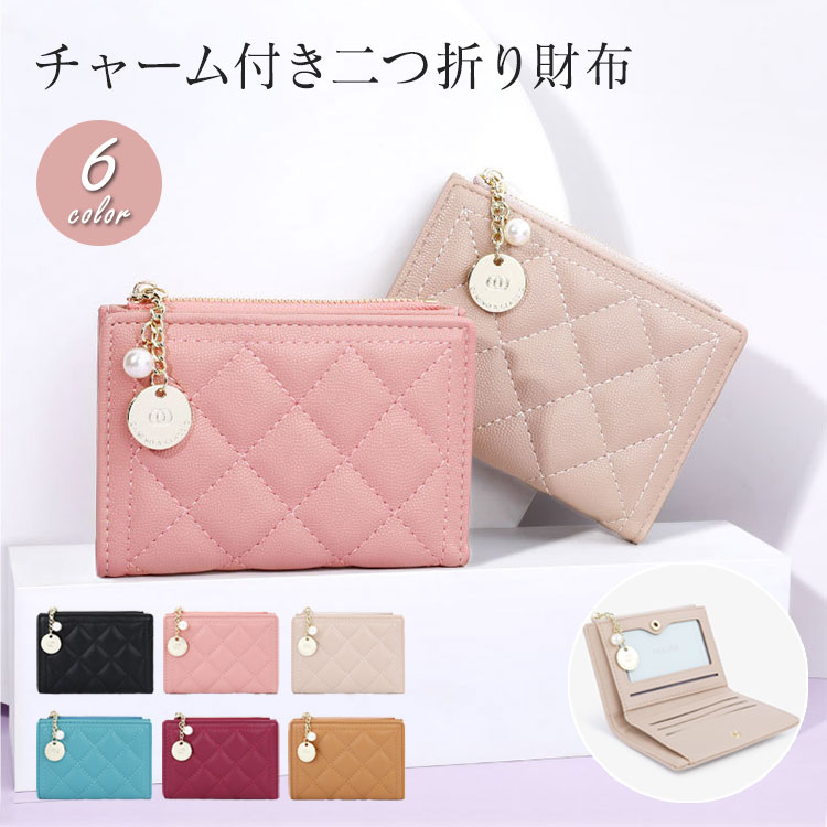 財布 レディース オシャレ 薄い 二つ折り 小さい キルティング レザー かわいい カード入れ 薄い財布 お洒落 大人 コンパクト 小銭入れ チャーム付き 女の子