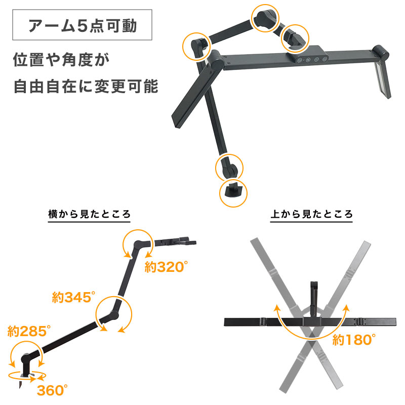 幅広いLEDライトで机の上を広く照らす、可変式のデスクライトです。