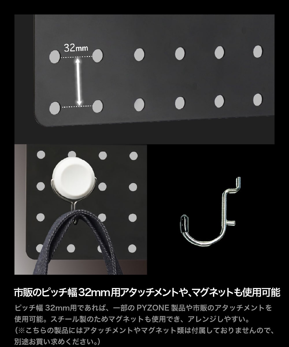 ◆市販のピッチ幅30mm用アタッチメントや、マグネットも使用可能ピッチ幅30mm用であれば、一部のPYZONE製品や市販のアタッチメントを使用可能。