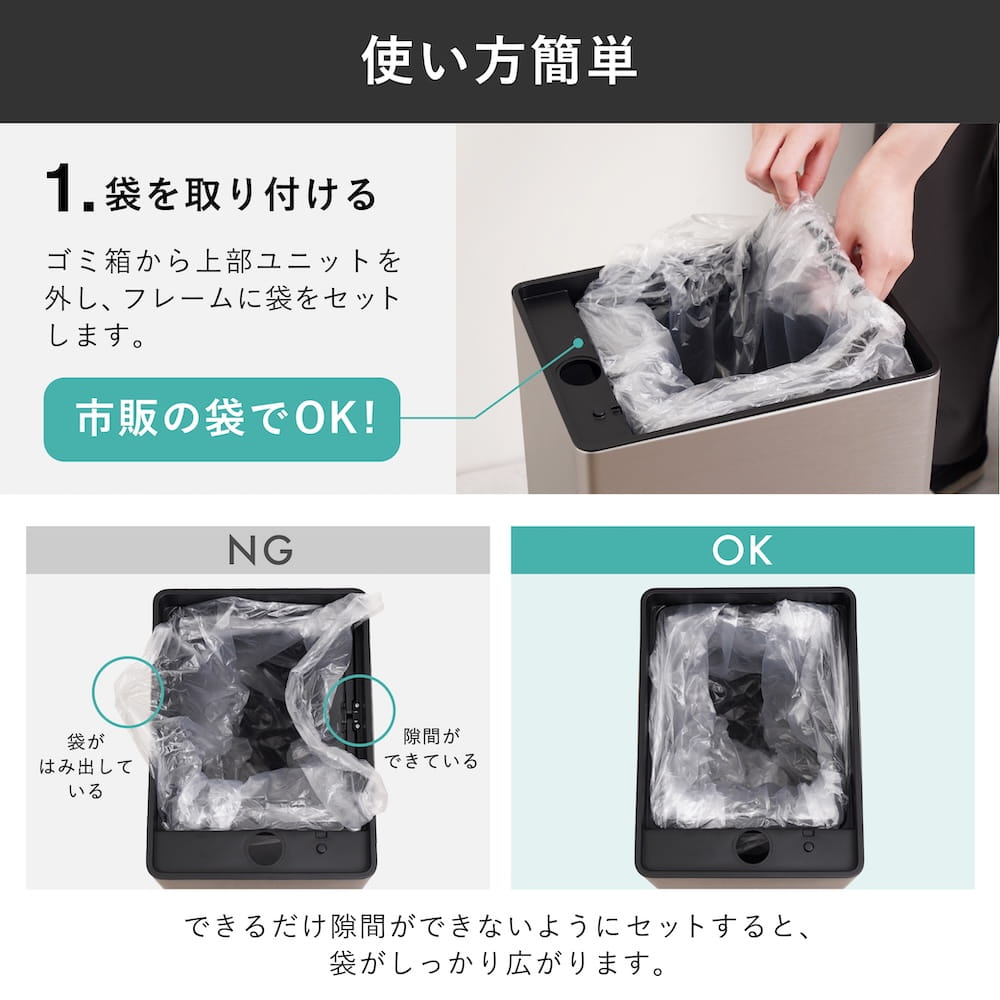 四隅までしっかり広がるので、ゴミ箱の隅々まで無駄なく活用。袋の浮きによる容量不足も解消します。