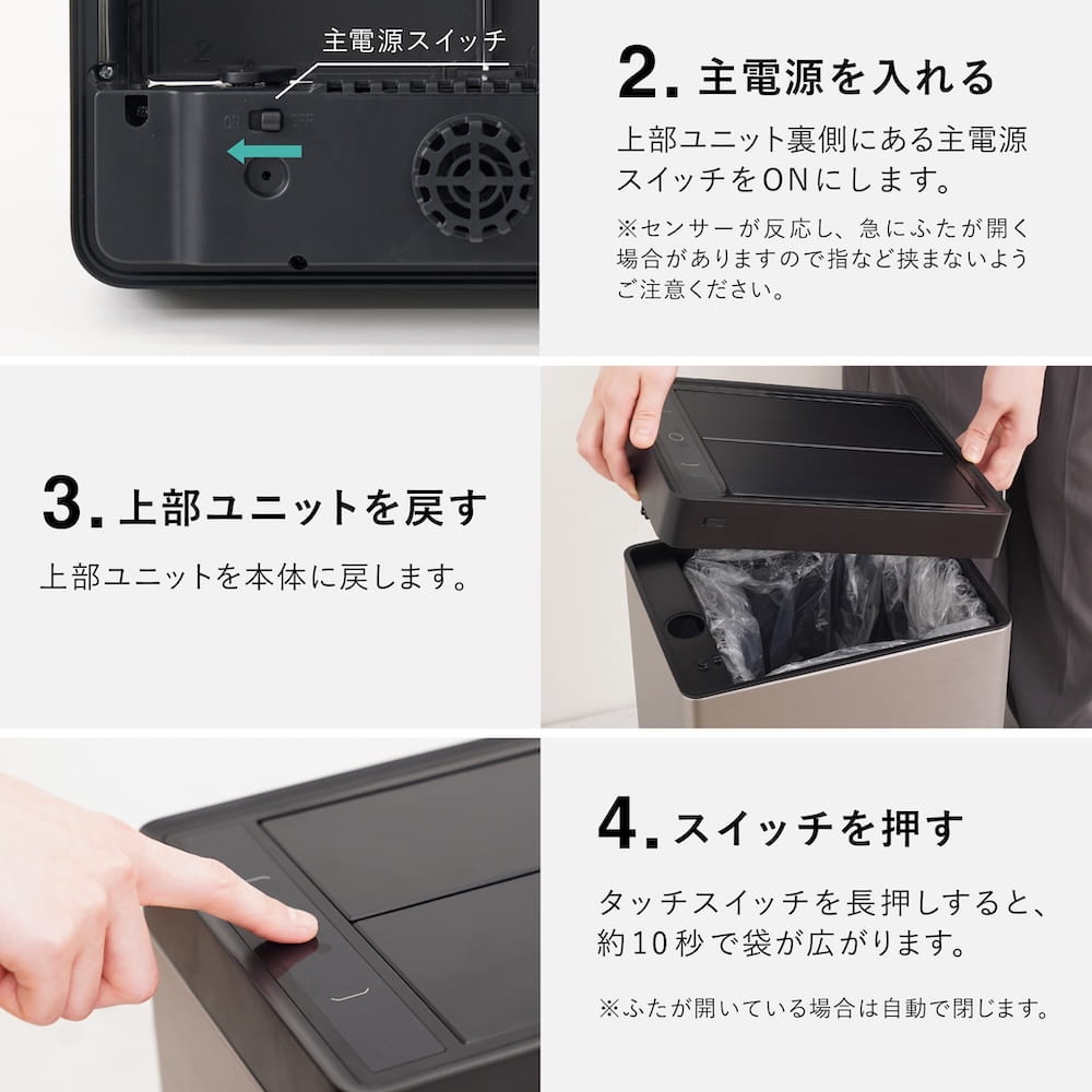 袋をセットしてボタンを押せば、ファンの風で瞬時に袋を展開。