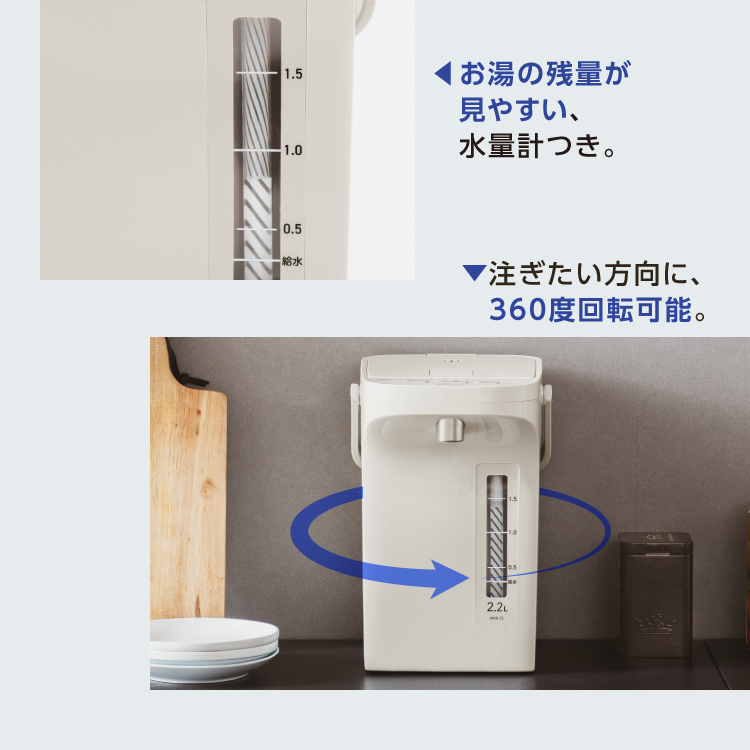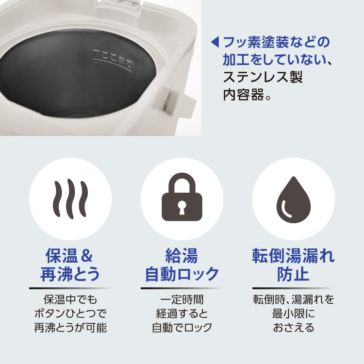 | 注意 | ・水を入れない状態で通電をしないでください。 ・湯沸かし中や沸とう直後の蒸気がでているときは本体を持ち運ばないでください。 ・火のそばに置かないでください。 ・水の入れすぎに注意してください。 ・乳幼児のいたずらに注意してください。 ・横転させて中身が流れ出ないように注意ください。 ・つけ置き洗いはしないでください。 ・水以外の飲みものや液体は入れないでください。 *画面上と実物では多少色が異なって見える場合がございます。 |