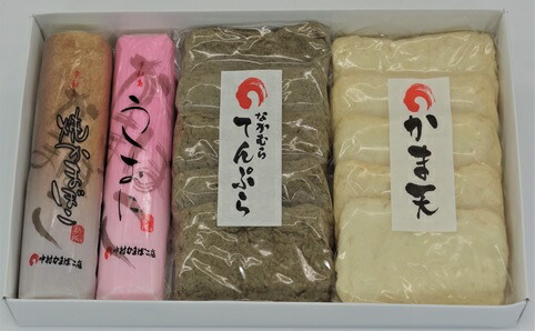 内容量:中村てんぷら(真空5枚)×1、かま天(真空5枚)×1、うしおにかまぼこ赤×1、焼きかまぼこ×1
