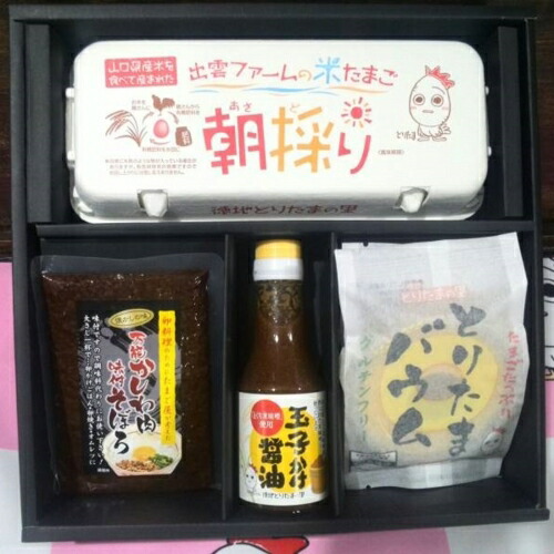 | 原材料 | ・たまごかけ醤油 醤油(国内製造)、砂糖、味噌、食塩、発酵調味料、だし(煮干、さば節、かつお節)、かつお節エキス、昆布エキス、酵母エキス / 調味料(アミノ酸等)、アルコール、(一部に大豆・小麦・さばを含む) ・とりたまバウム 卵(山口県徳地産)、砂糖、マーガリン、米粉、乳等を主要原料とする食品、コーンスターチ、ショートニング、水飴、澱粉 / トレハロース、クロレラエキス、乳化剤、ベーキングパウダー、香料、(一部に卵・乳成分・大豆を含む) |