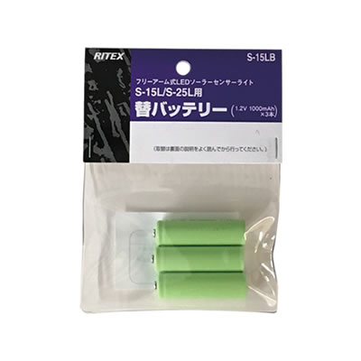 1.3W×1灯 フリーアーム式 LEDソーラーセンサーライト(S-15L)と1.3W×2灯 フリーアーム式 LEDソーラーセンサーライト(S-25L)専用の「S-15L/S-25L用 替バッテリー S-15LB」です。消耗したバッテリーの交換用として。