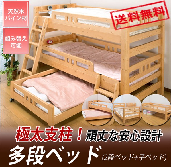頑丈パイン材多段ベッド 上段ベッド+下段ベッド+子ベッド(HR-500 ULK)LBR/WH 『時間指定不可 東北/九州/四国配送不可』