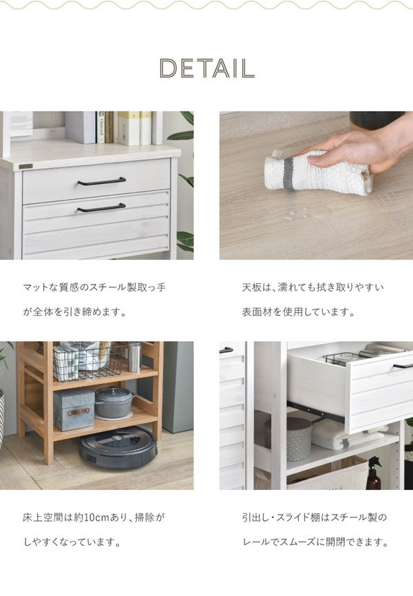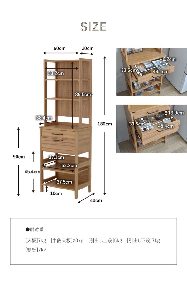 耐荷重:[天板]7kg [中段天板]20kg [棚板]7kg [引出し上段]5kg [引出し下段]7kg
