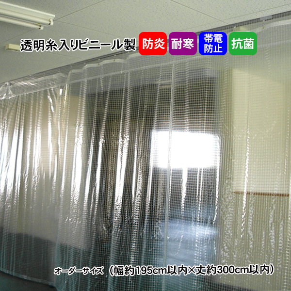 透明糸入り ビニールカーテン MT-1030-8 オーダーサイズ (幅約195cm以内×丈約300cm以内) 0.3mm厚 耐寒・帯電防止・抗菌・防炎