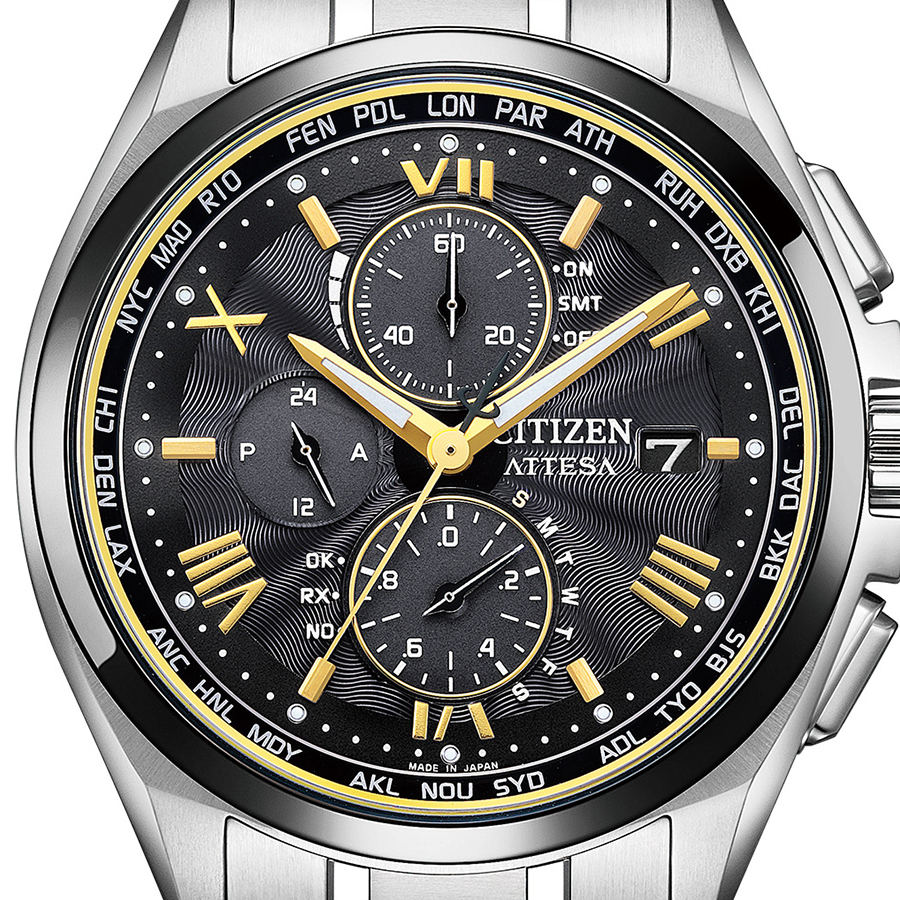 ロングセラーの人気モデル「AT8040」をベースにアレンジ。中心からまっすぐ広がっていく光を文字板上にデザインしました。
