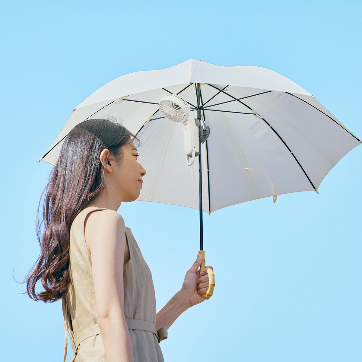 大風量の2重反転ハンディファン Silky Wind Mobile 4シリーズ を日傘に取り付けられるクリップです。歩いている時に心地よい涼しさを感じられるベストな風を考えました。