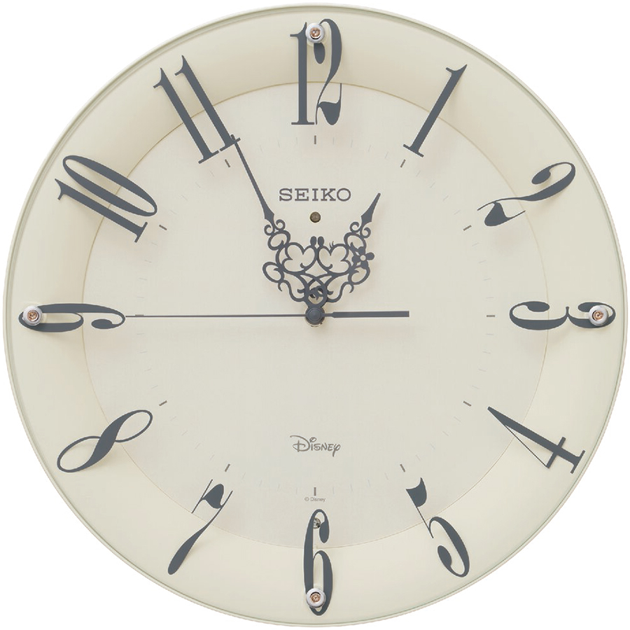 ミッキーとミニーが一時間に一度キスをするロマンチックな針が特長的な掛時計です。すれ違う際にはしっぽ同士でハートを形作ります。