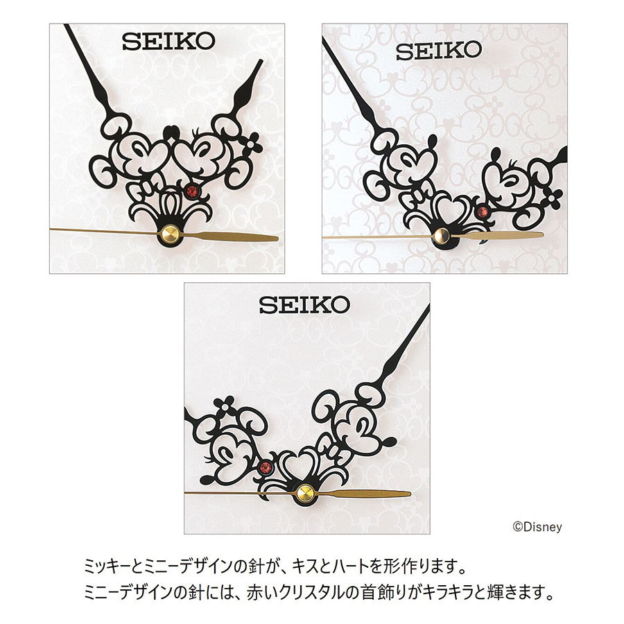 ミッキーとミニーが一時間に一度キスをするロマンチックな針が特長的な掛時計です。すれ違う際にはしっぽ同士でハートを形作ります。