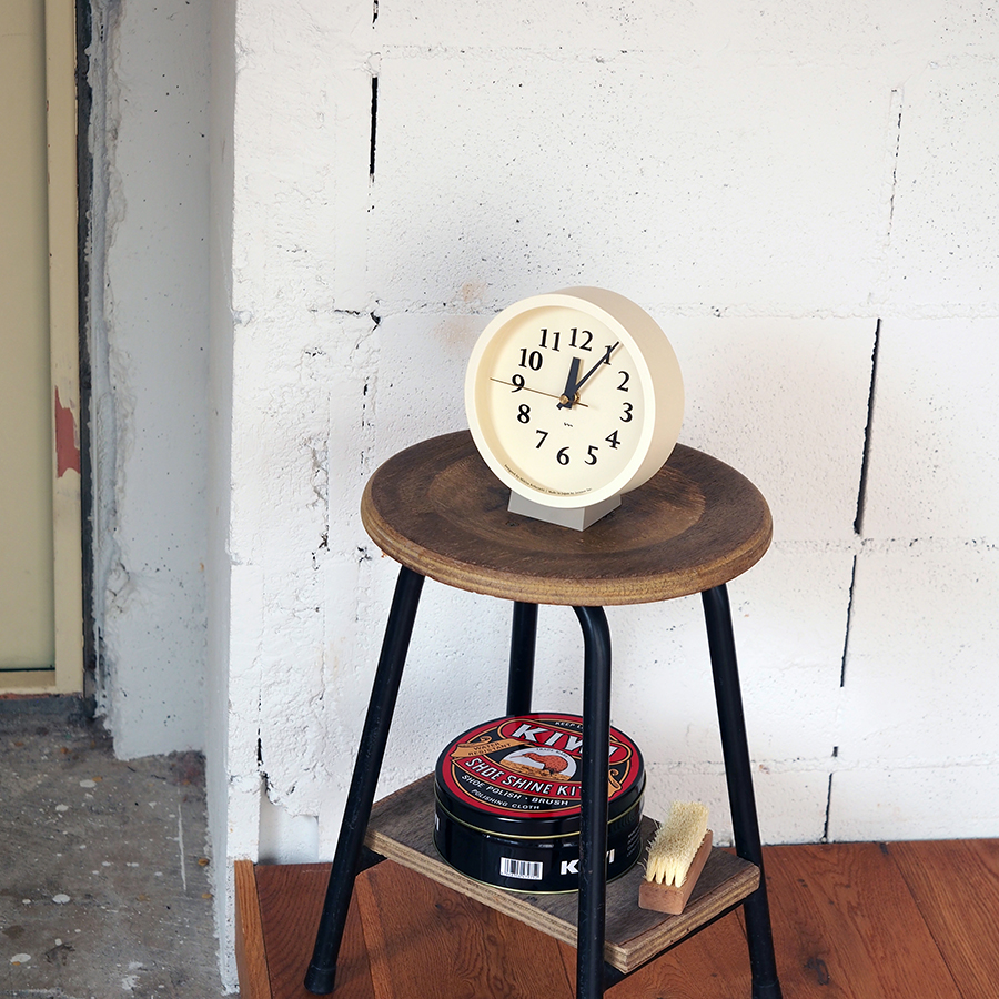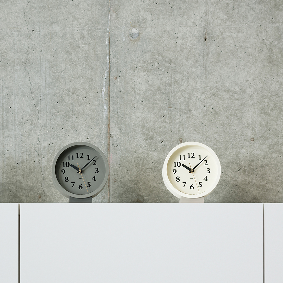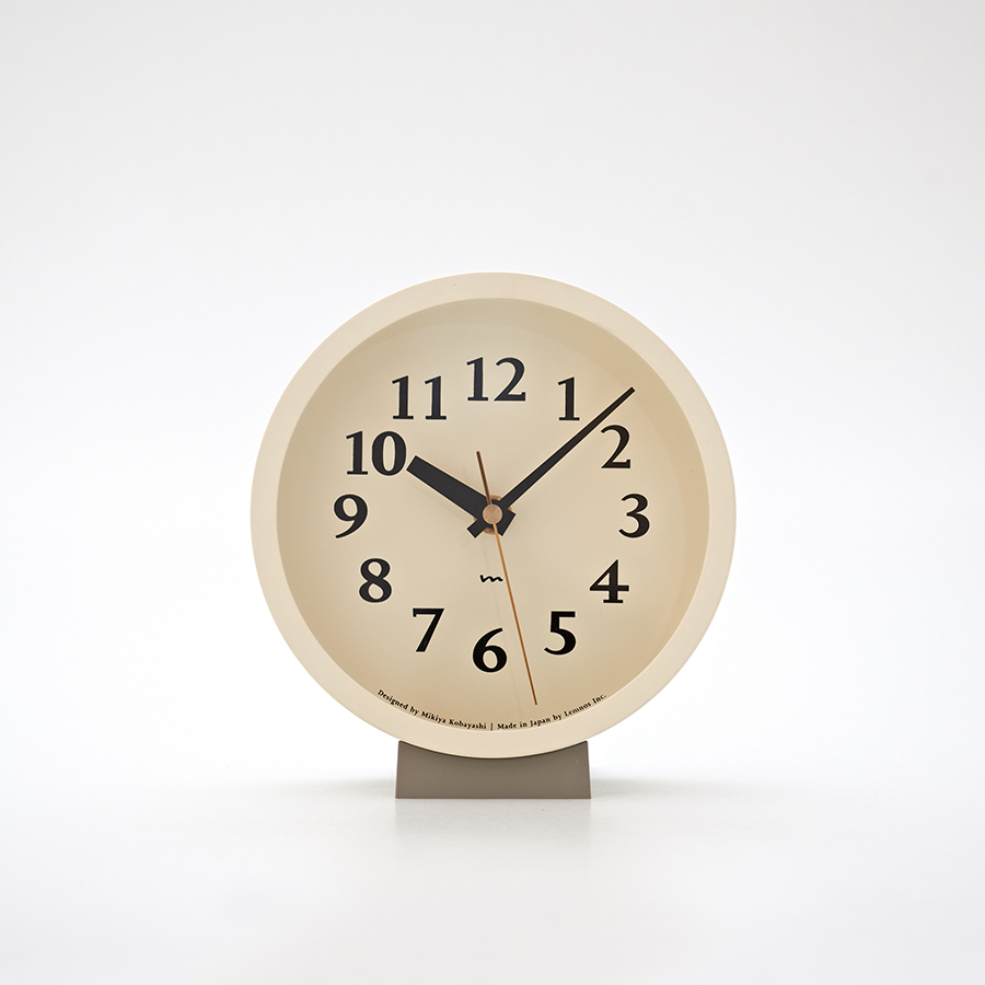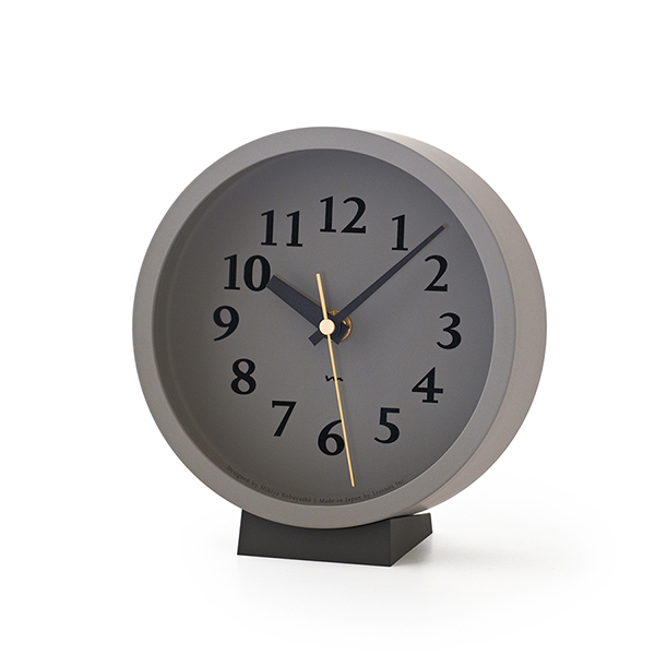 小ぶりな盤面に小気味よく数字をちりばめた置き型の電波時計です。針の長さや太さ、数字のサイズ、色の構成などを吟味し、見やすく心地よい佇まいの時計となりました。真鍮色の秒針が盤面を引き立てます。