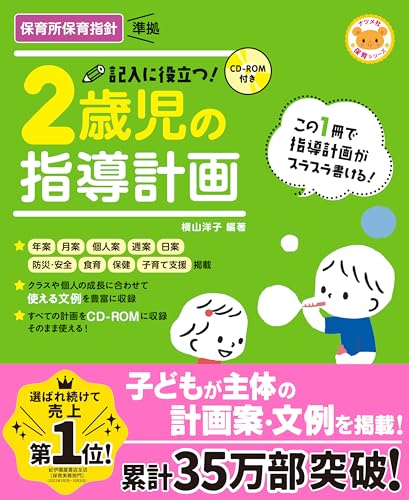 平成30年の新保育所保育指針に対応しました 平成30年実施の新保育所保育指針に準拠した内容で、リニューアルしました 2歳児の指導計画の特徴 本書は、2歳児クラスのための指導計画の年案と月案、週案、日案、毎月の個人案の立て方 に加え保育日誌の書き方も一つ一つやさしく解説しています。文例が豊富なので各クラスや、 ひとりひとりの成長にあった指導計画を書くことができます。 また、第7章のニーズ対応の章では、子どもたちの身を守るための防災・安全計画から、 保健計画や食育計画、地域の子育て支援の指導計画の書き方まで丁寧に解説しています。 指導計画をどのように考えるのか、文章はどのように書き、個人差にはどう対応する のかなど、現場の先生の声を取り入れながら、わかりやすく解説しています。 はじめて書く方でもわかりやすい 指導計画についてやさしく解説 巻頭では、フルカラーで指導計画をつくる目的から、年間計画や月案、保育日誌など 各項目で何をどのように書けばいいのかをイラストや図解を使いながら丁寧に説明しました。 はじめて指導計画を書かれる方でも安心して読んでいただける1冊に