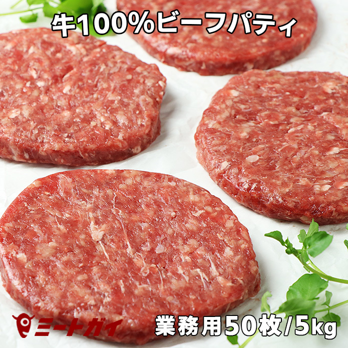 ミートガイオリジナルの牛肉パティ。100%牛肉使用のハンバーガー用ビーフパティです。つなぎとして塩と、片栗粉を使用しています。1枚100gとたっぷりサイズのパテが50枚入り。