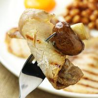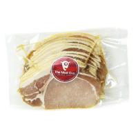 赤身の多いポークロインを天然海塩とスペシャルブレンドのスパイスで浸けこみ、コーンミール(とうもろこしの粉)を外側に塗しました。主にカナダやイギリスでポピュラーなベーコンです。日本でもお馴染みのバラ肉を使った脂肪が層になった細長いベーコンに対して、バックベーコン(Back Bacon)はトンカツなどに使われるロース肉が使用されます。どちらかと言うと、塩漬けハム・塩漬けポークに似たような味わい。