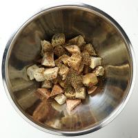 1.ボールにパンの角切り、ハムとスパイスミックスを入れます。(スパイスの量はお好みで調整してください。)