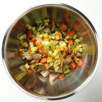 2. セロリ、にんじんをしんなりするまで炒め、1のボールに入れます。