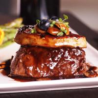 フィレステーキの上にフォアグラを乗せ、ソースをかけて。温野菜やマッシュポテトなどお好みの付け合わせを盛りつければ「牛フィレのロッシーニ風」の完成です。