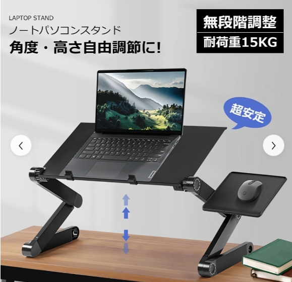 ウス置き場付きの折りたたみ式PCスタンド、角度と高さを調節可能、持ち運びに便利でポータブル、雑誌を読んだりリラックスしたりするのに最適、黒色