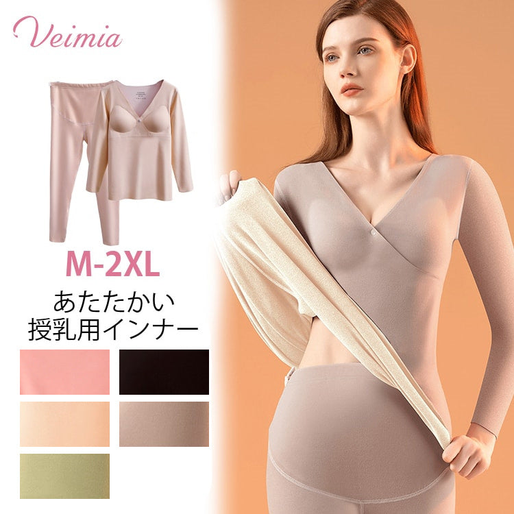 VEIMIAマタニティ授乳インナー あったかマタニティインナーセット パッド付 Vネック マタニティウェア上下セット 授乳 無地 裏起毛 長袖 寒え対策 妊娠 産後