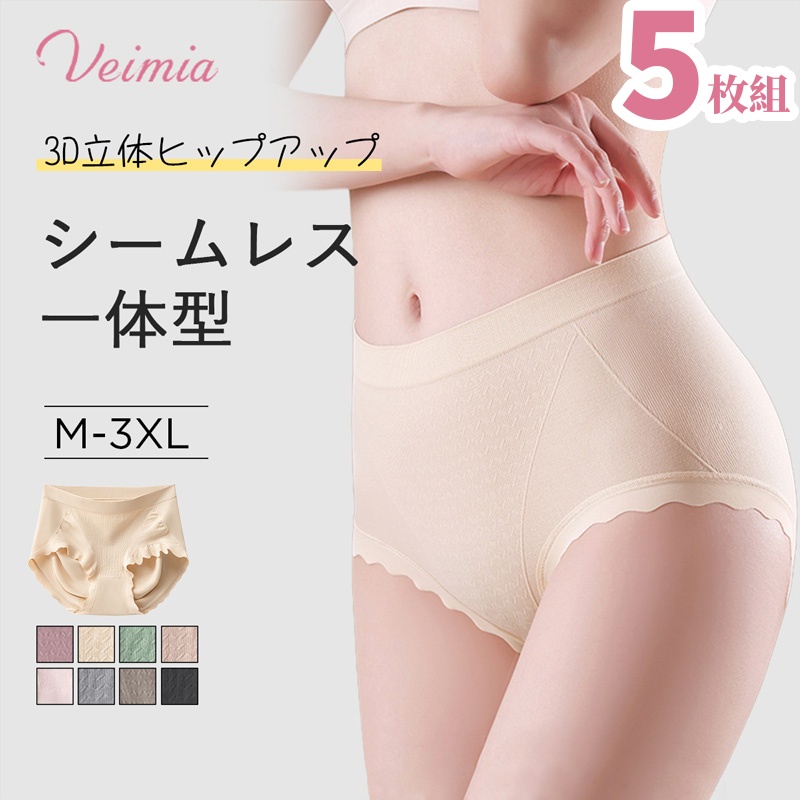 VEIMIA シームレスショーツ [5枚セット] 深ばき ハイウエスト パンツ すっぽりショーツ 女性 下着 美尻ショーツ 補正下着 お腹まで包む 締め付けない 吸汗速乾
