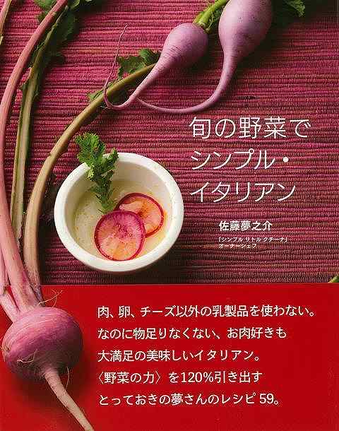 著者は東京・小石川のイタリアンレストラン「シンプル・リトル・クチーナ」のオーナーシェフです。料理は野菜が中心で、肉、卵、チーズ以外の乳製品を使いません。しかし肉好きが敬遠する「健康そうだけど物足りない料理」ではなく、肉好きをも満足させる充実した美味しさが特徴です。秘密は昆布だしをはじめとするだしの使い方にあります。かといって和風イタリアンではなく、佐藤夢之介のイタリアンとしかいえない料理なのです。