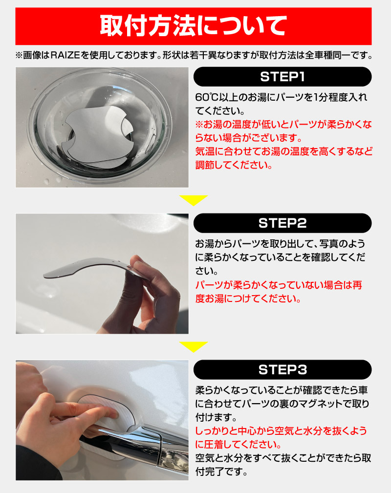 よくある粘着式ではなく当店オリジナルのマグネット装着タイプなので、十分な温度のお湯で柔らかくして貼り付けるだけで簡単に装着可能!