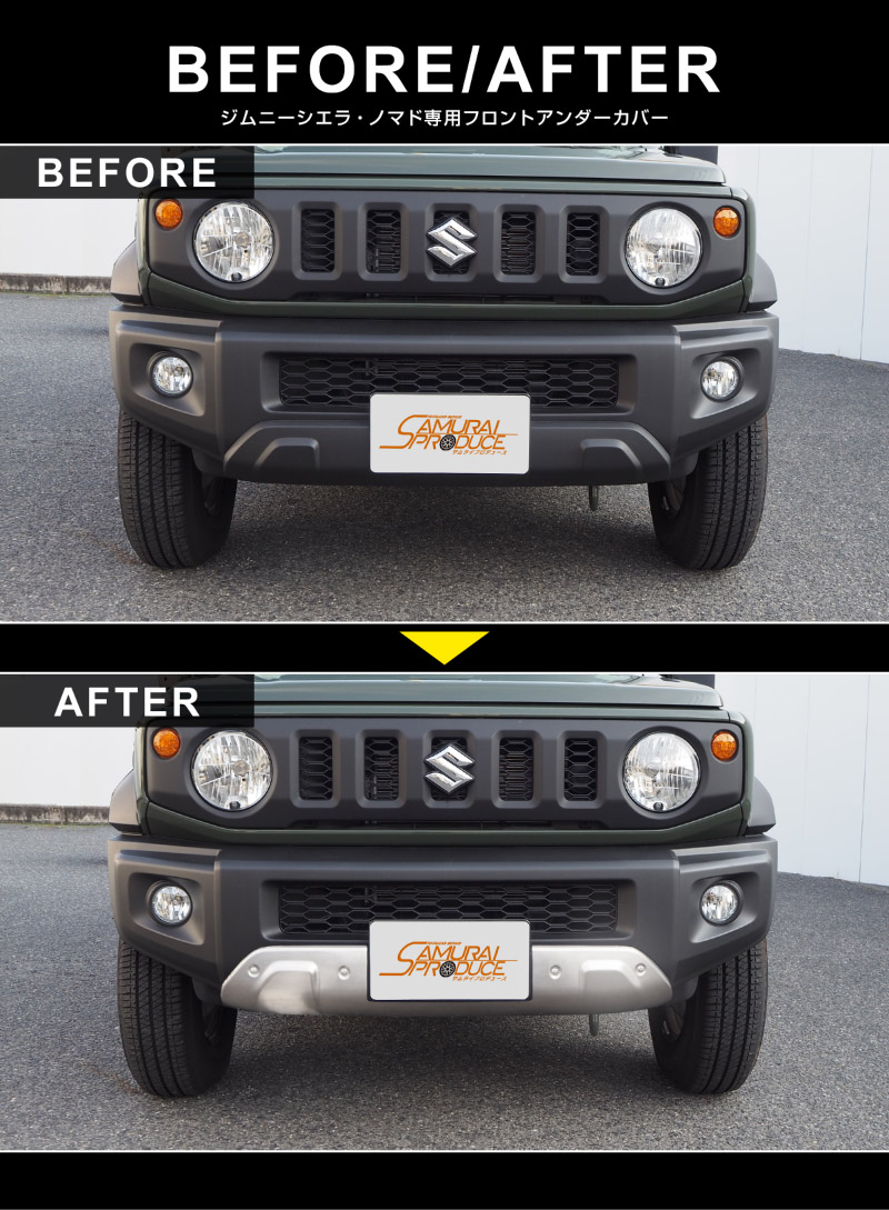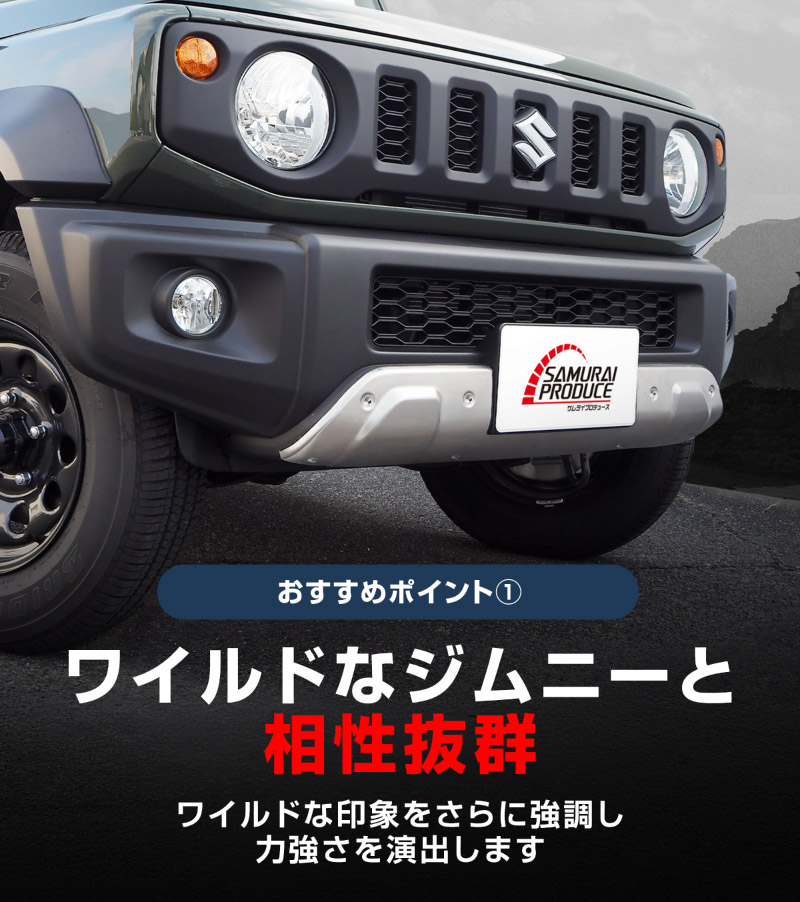 ジムニーシエラ・ジムニーノマド専用のフロントバンパー下部に装着するドレスアップパーツです。