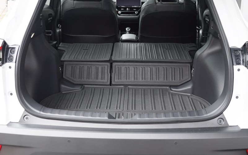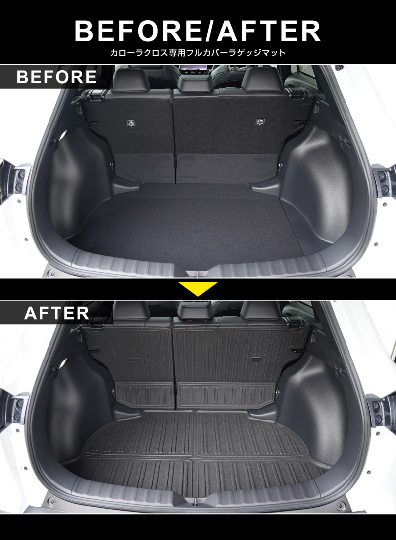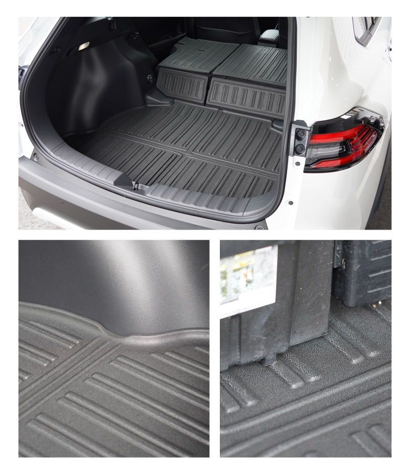 トヨタのカローラクロス専用(日本仕様)のセカンドシート背面とラゲッジスペースに取り付けるラバータイプのマットです。
