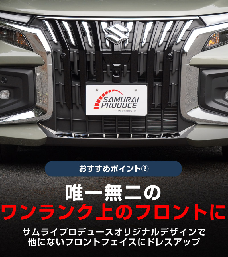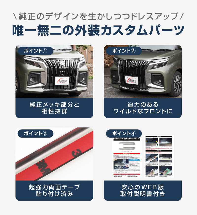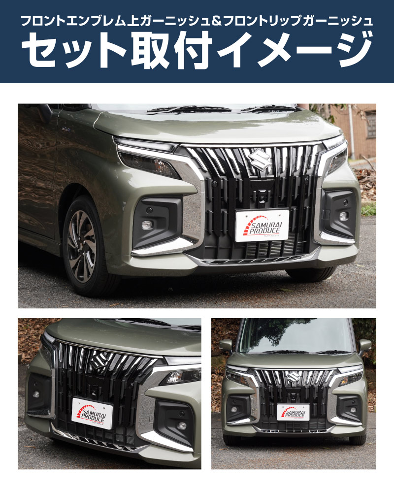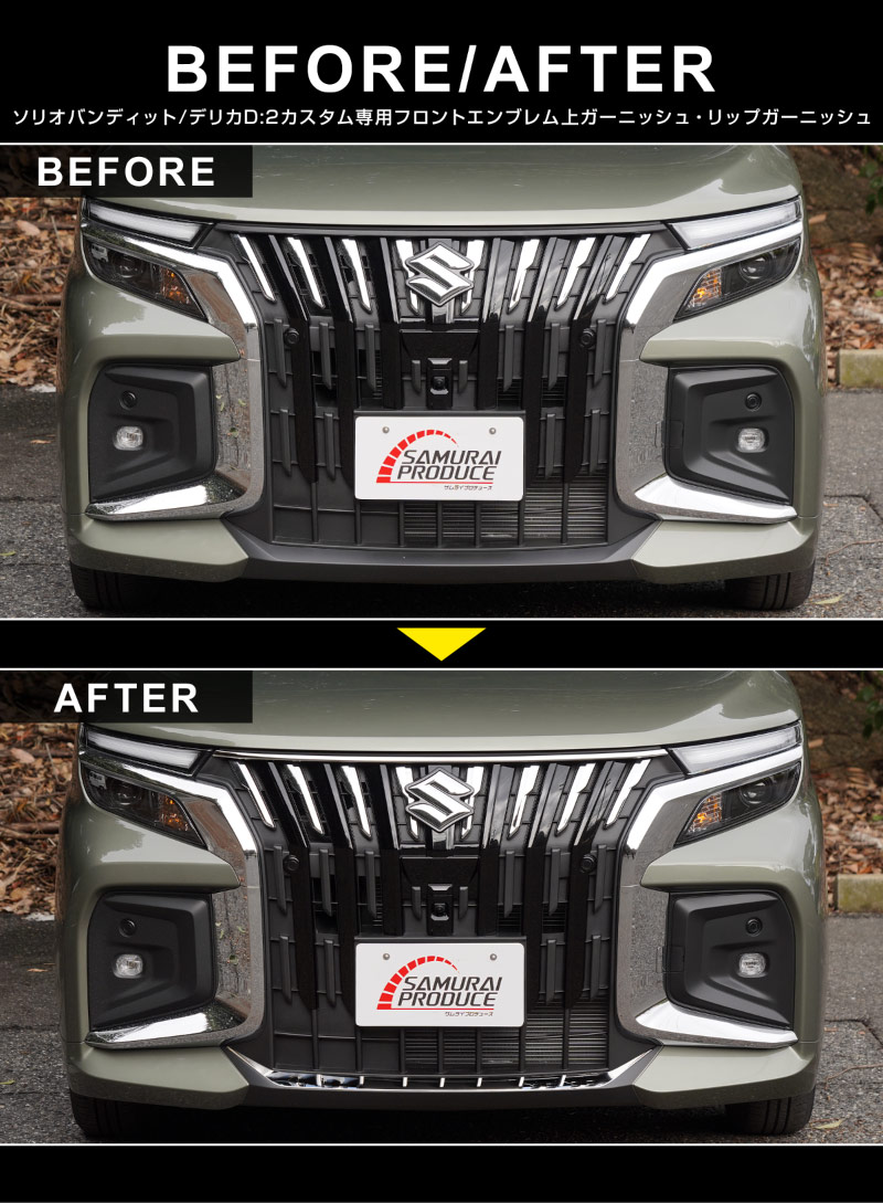 新型ソリオバンディット・デリカD:2カスタム専用設計のフロントエンブレム上部とリップ部分に装着できるドレスアップパーツのセットです。