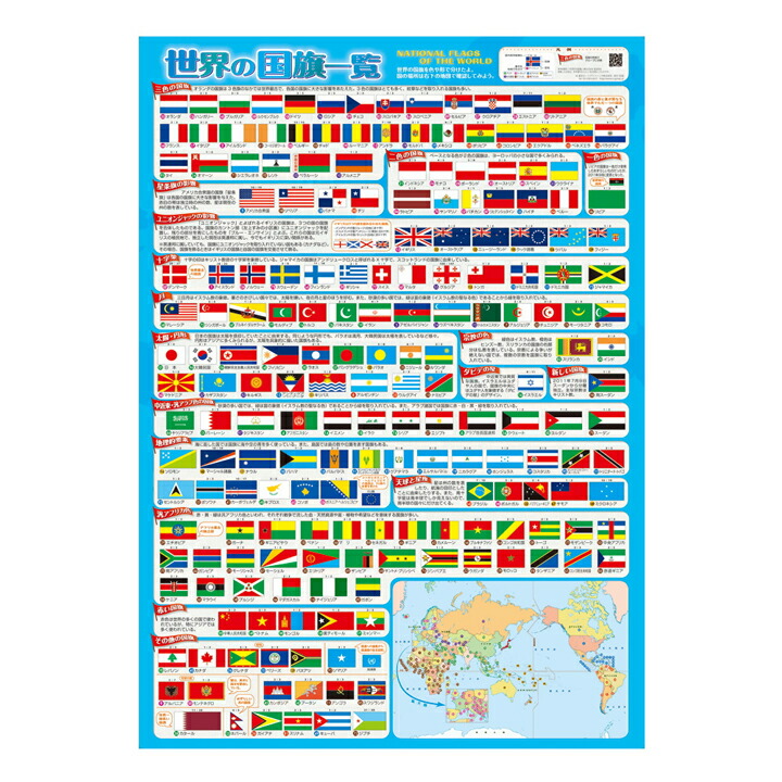 ●国旗の模様の意味、地域ごとの特色、宗教との関係、歴史との関係など、様々な視点から国旗を解説しています。 単なる国旗のポスターではなく、国旗の持つ意味を知ることが出来るポスターです。