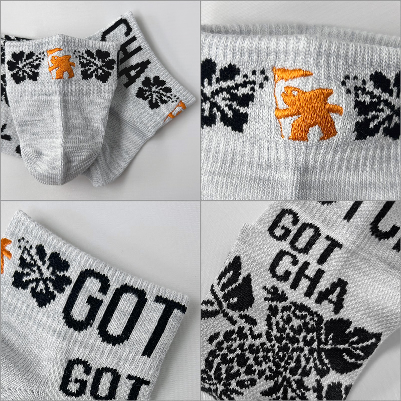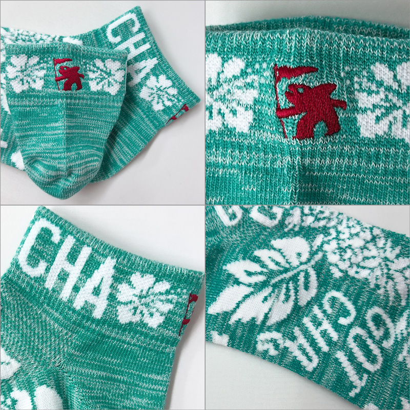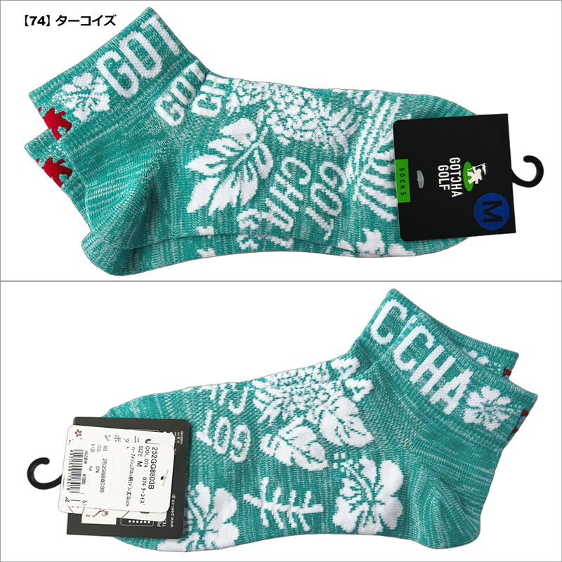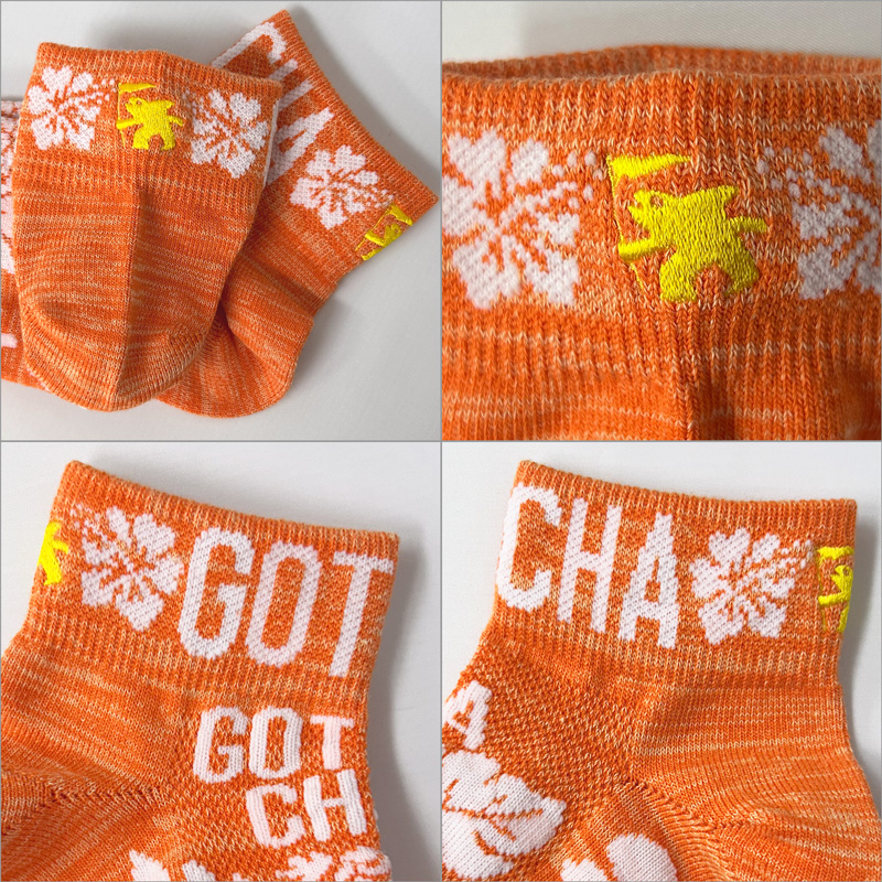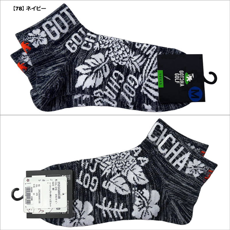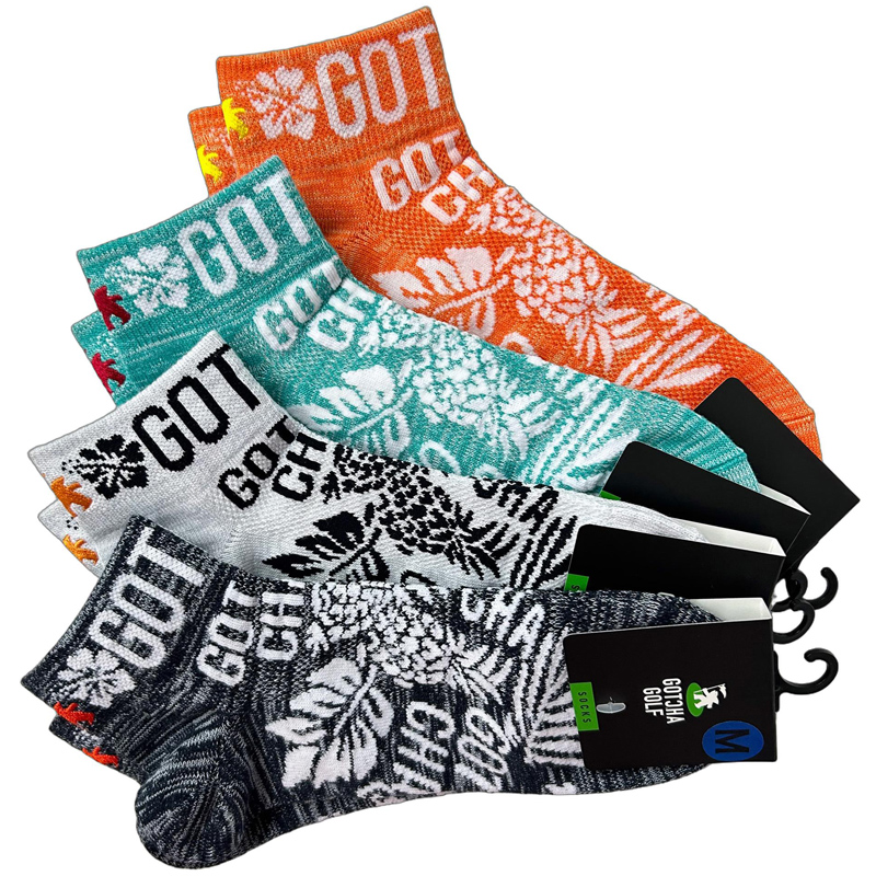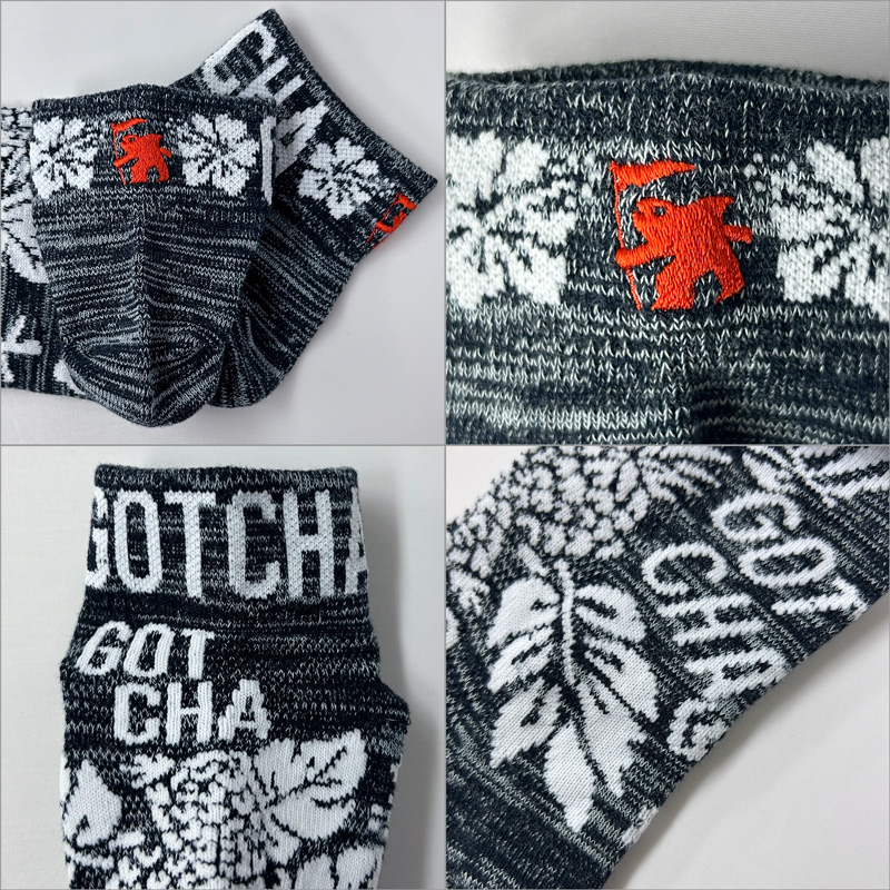 パイナップル、ハイビスカス、リーフのデザイン、目を惹く配色が特徴的なソックス