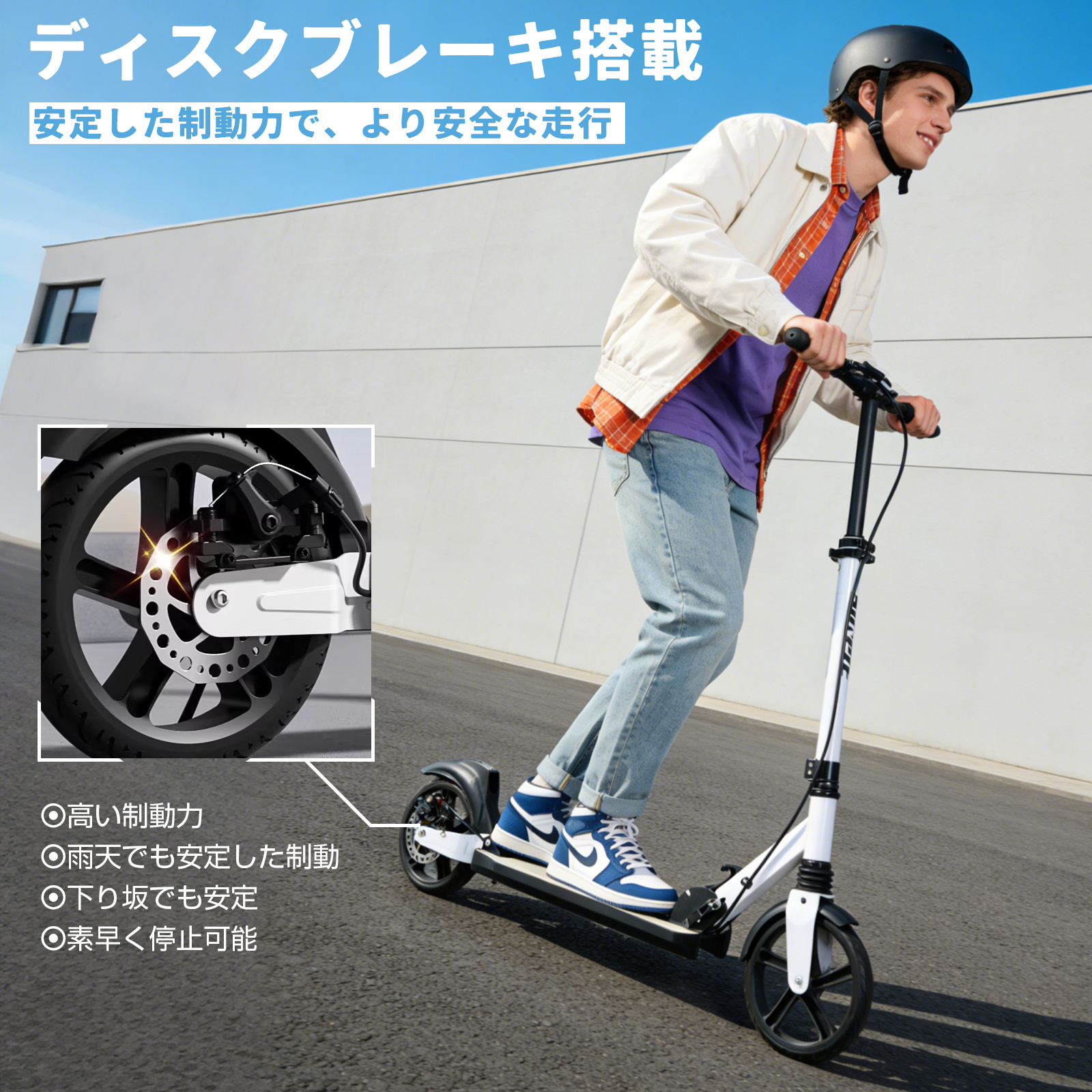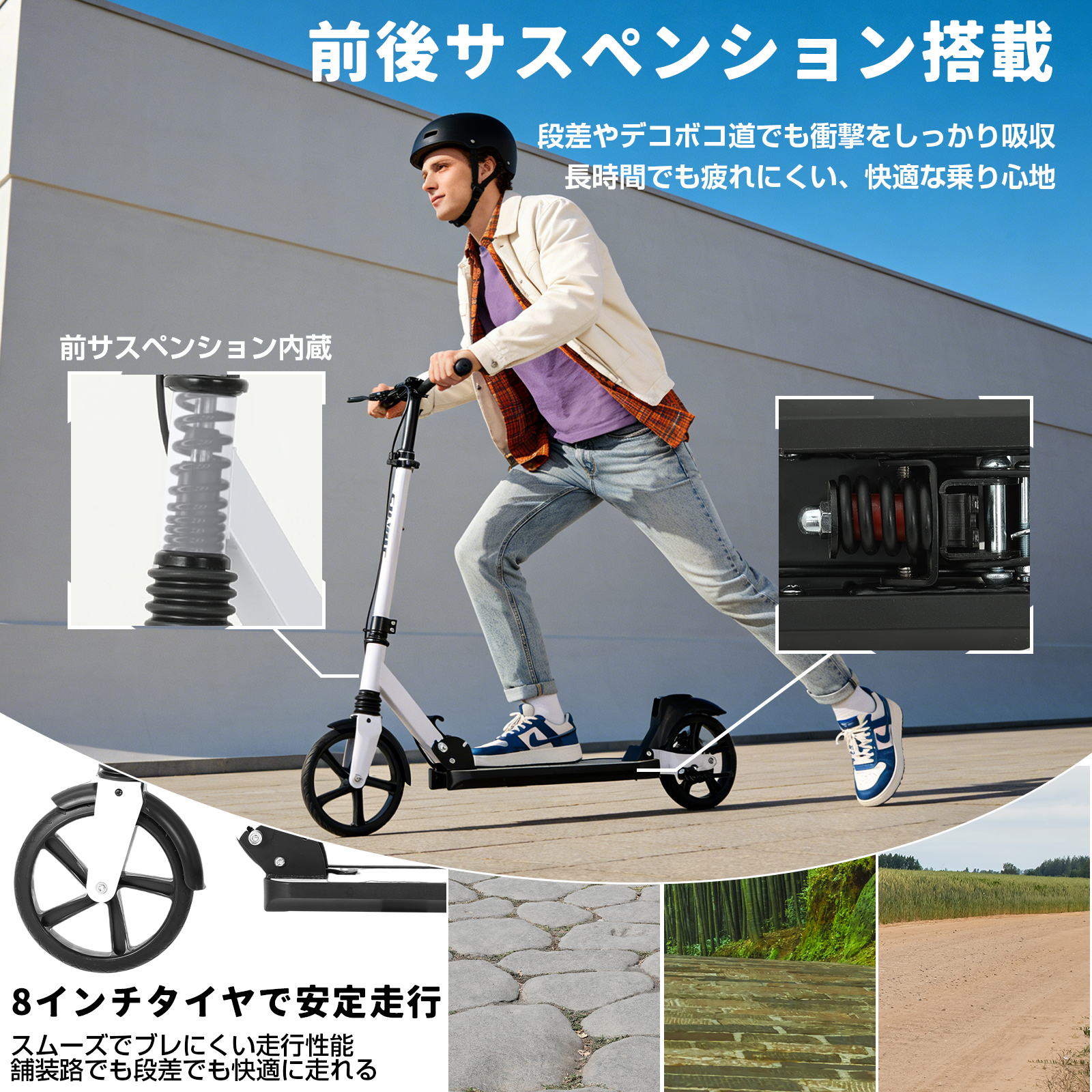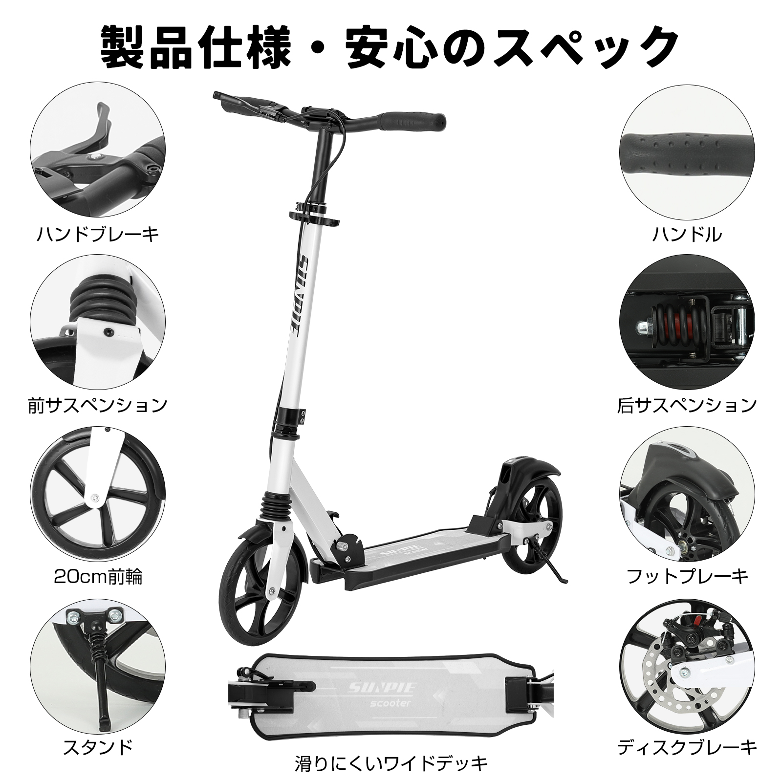 ★安定した滑走を実現:ハンドブレーキとフットブレーキがあるので安心。サスペンションが前後に入っていて乗り心地がいい 。軽量タイプ商品はスタンドもついているので、出先でも置き場所に困らずとても便利です。行楽やちょっとしたお使い等に重宝する折りたたみキックボードです。