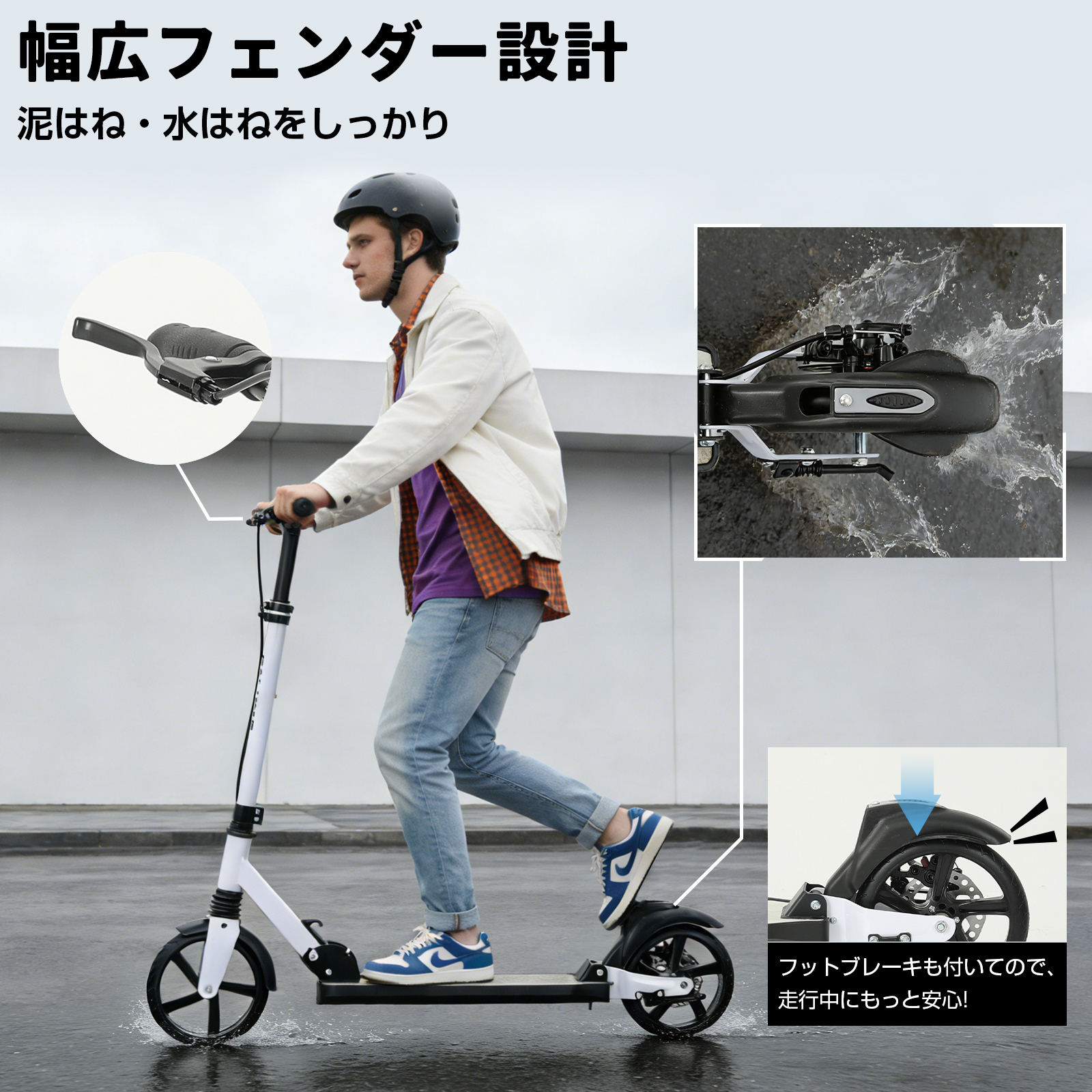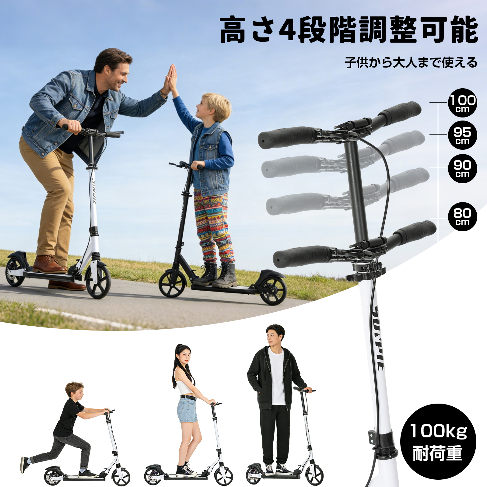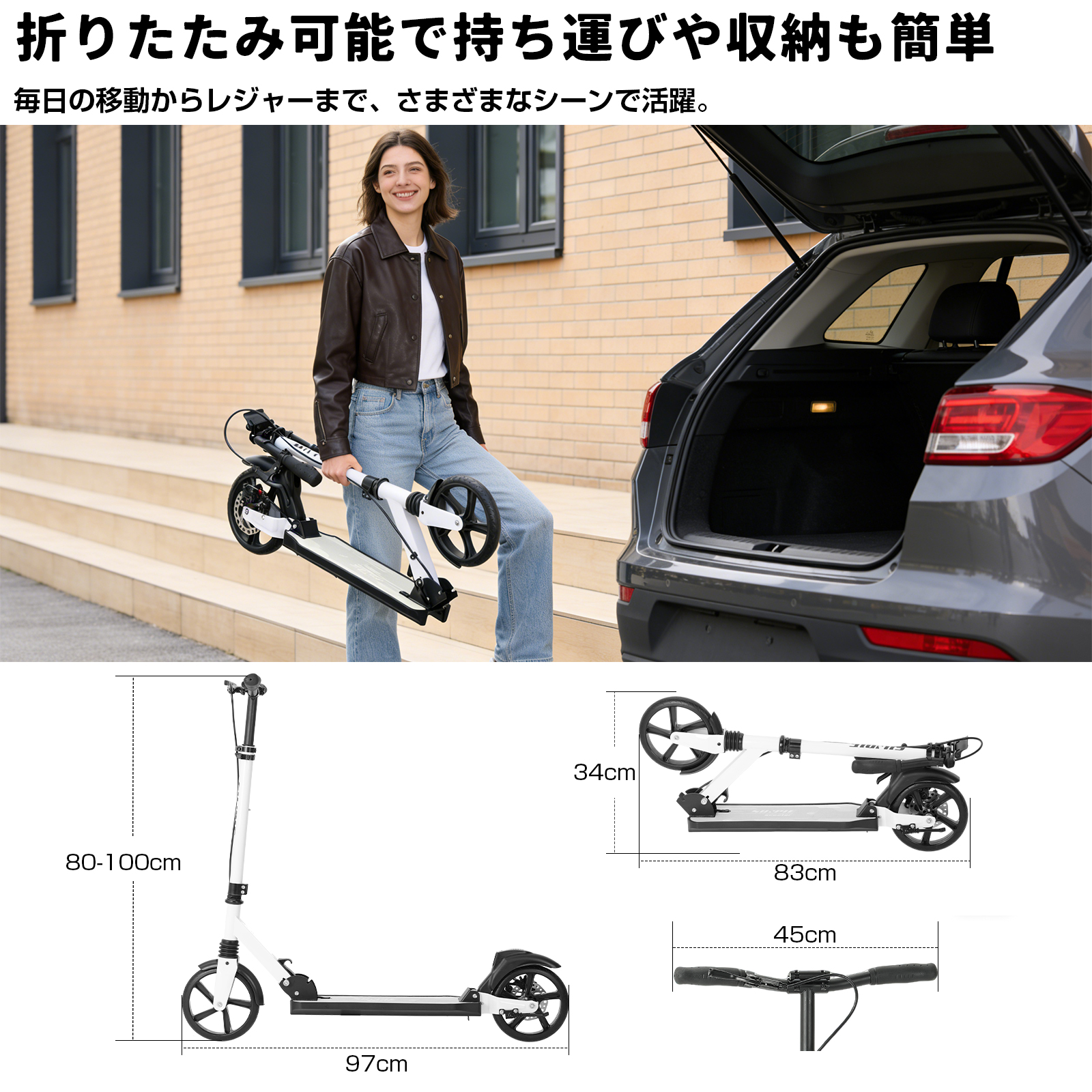 ★安定した滑走を実現:ハンドブレーキとフットブレーキがあるので安心。サスペンションが前後に入っていて乗り心地がいい 。軽量タイプ商品はスタンドもついているので、出先でも置き場所に困らずとても便利です。行楽やちょっとしたお使い等に重宝する折りたたみキックボードです。