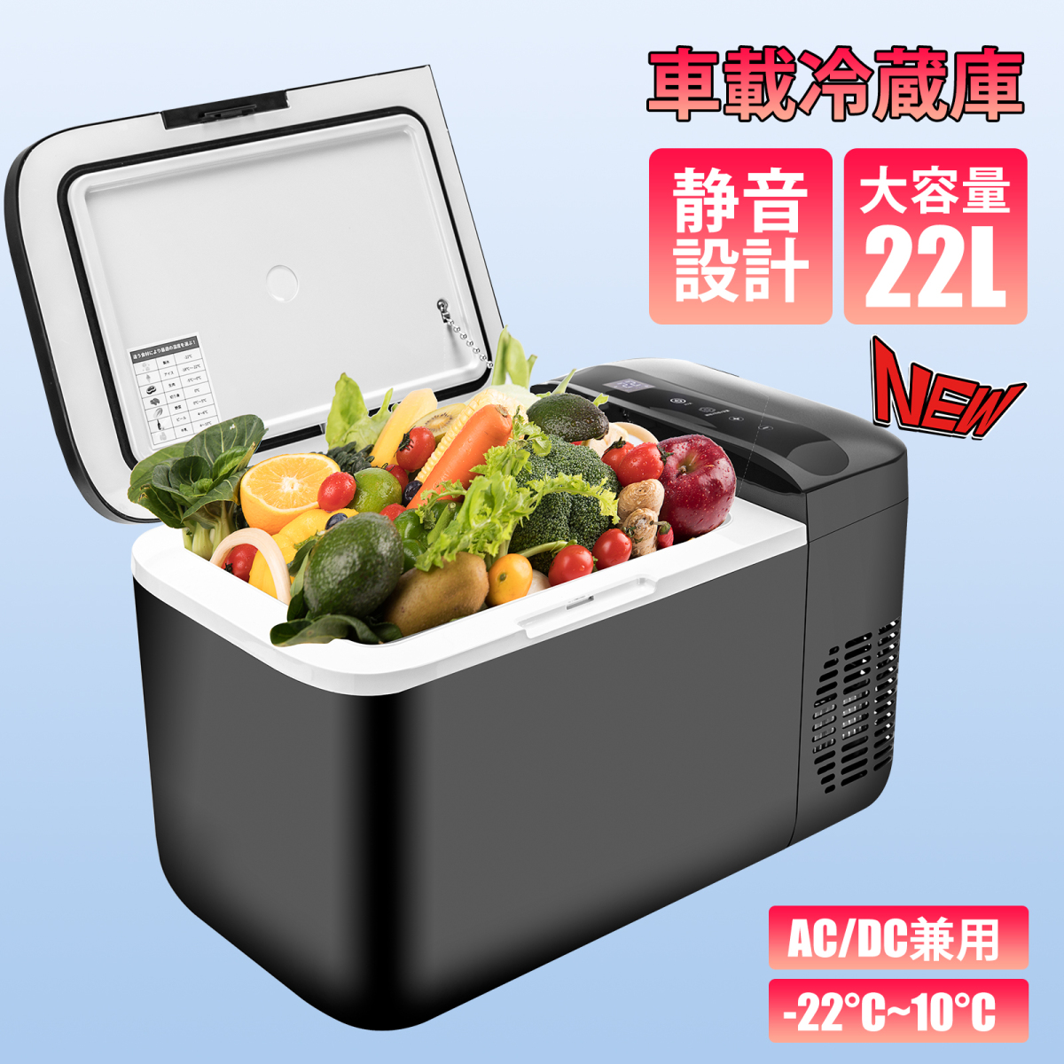 車載冷蔵庫 22L -22℃〜10℃ 45W ポータブル冷蔵庫 クーラーボックス 急速冷凍 AC100V 12V 24V 車載/家庭用 静音 1年保証 DC/ACアダプター付 キャンプ 車中泊