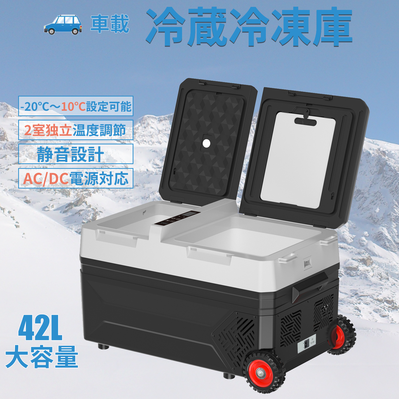 ポータブル冷蔵庫 車載冷蔵庫 42L 2室温度調節 冷凍庫 庫内灯付 -20℃〜10℃ 60W 2WAY電源対応 小型冷蔵庫 急速冷凍 12V/24V車に対応 AC/DC電源対応 1年保証