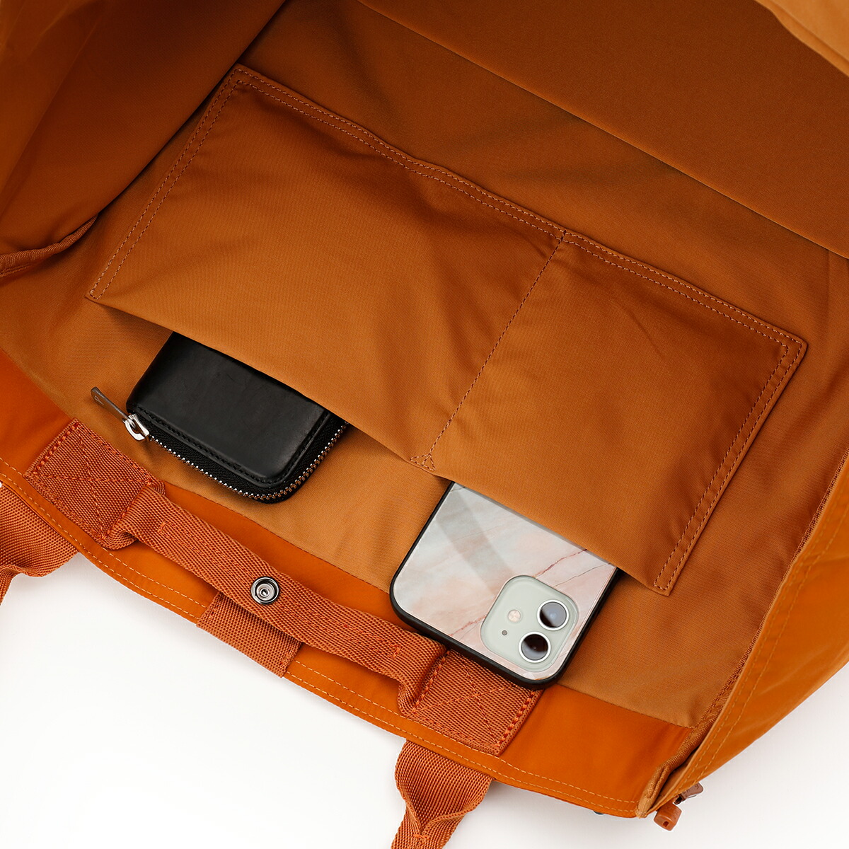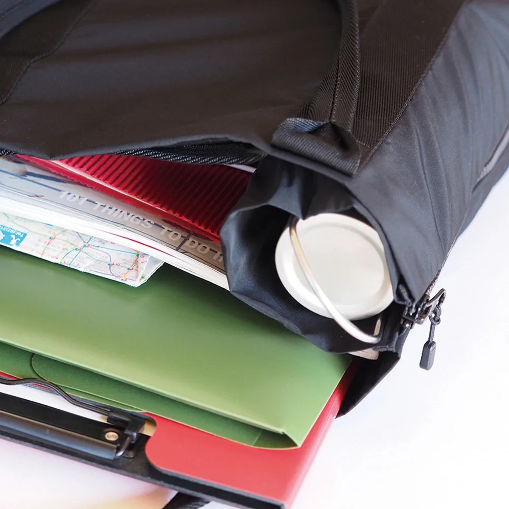 | A4サイズ対応のフラットバッグの時は、マチ部分が内部にくることで、ポケットになり、折り畳み傘などを収納可能に! |