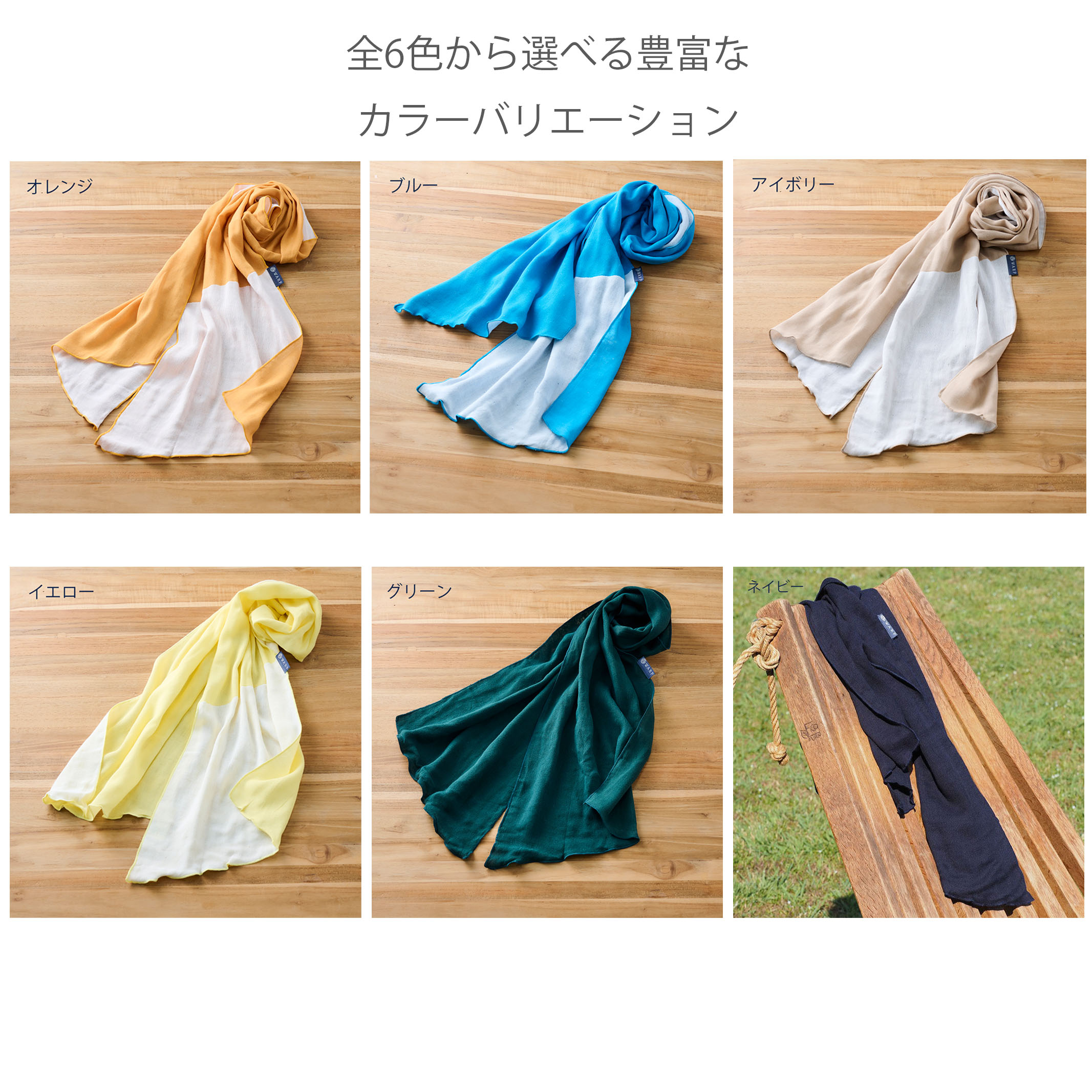 | 写真上:左から オレンジ、ブルー、アイボリー 写真下:左から イエロー、グリーン、ネイビー |