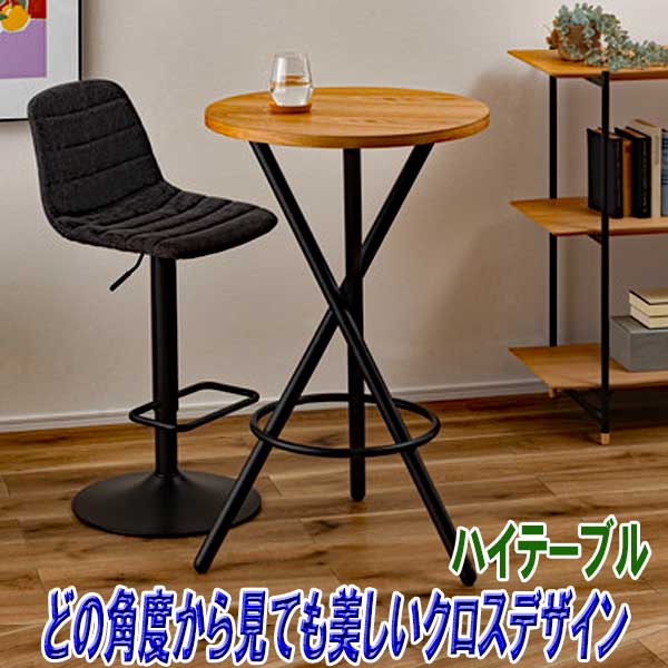 ハイテーブル 丸 高さ90タイプ 木目調天板 ブラックスチール 3本脚 クロスデザインは、どの角度から見ても美しいハイテーブル、丸いナチュラルな木目調天板は温かみがあるハイテーブル丸タイプは、他のインテリアとも相性よくなじみお部屋を演出してくれます。高さ96cmのクロスした3本のブラックスチール脚がスタイリッシュなハイテーブル高さ90タイプの黒3本脚デザインです。太いブラックスチールの脚部が空間を引き締めシックで上品のハイテーブルです。幅60cm、高さ96cmのカウンターハイテーブルとして使いやすいサイズ感も魅力的、おしゃれに使えるハイテーブルです。