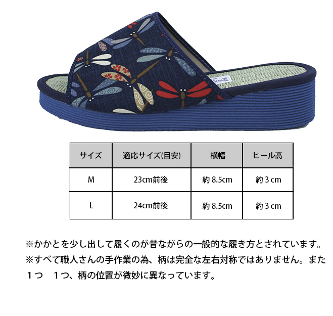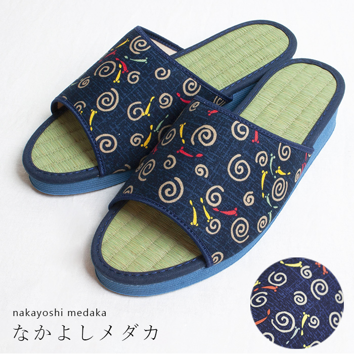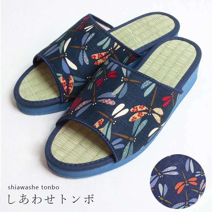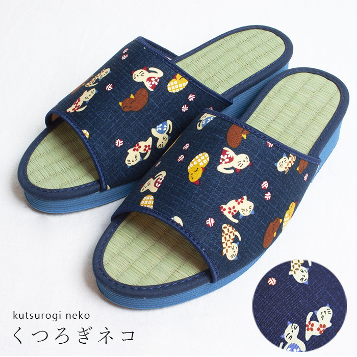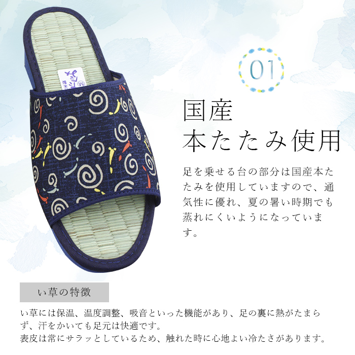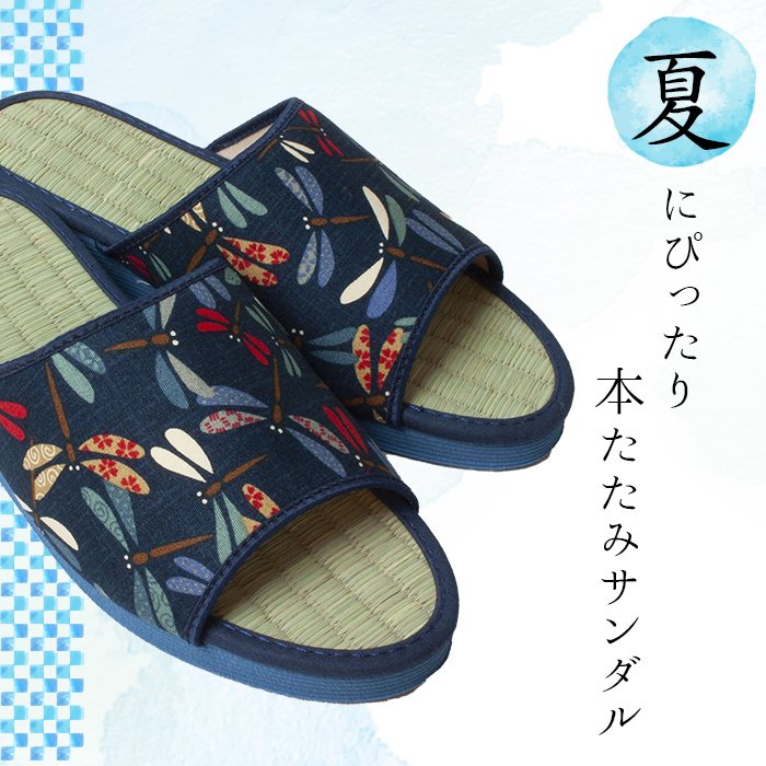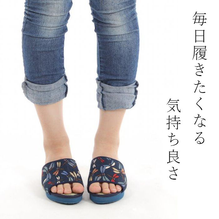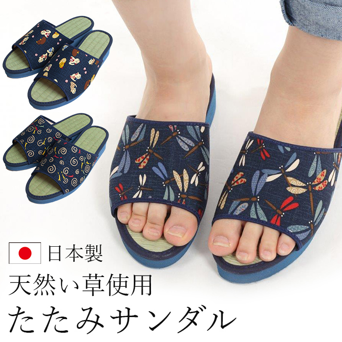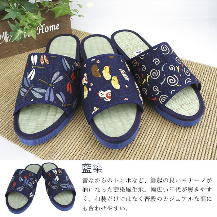 【5のつく日】い草スリッパ 畳 サンダル レディース 紺 藍染め 和柄たたみサンダル 室内履き 外履き 猫 トンボ めだか M/L 可愛い