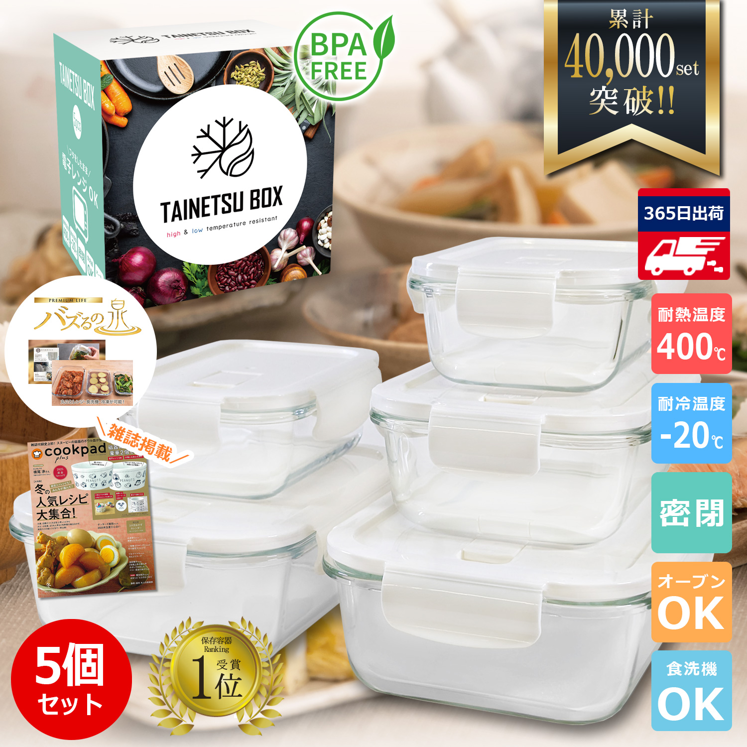 【バズるの泉 クックパッドplus掲載】 耐熱ガラス容器 耐熱容器 満足度100% フタをしたまま電子レンジ対応 オーブン 蓋付き 密閉 タイボ 5個セット