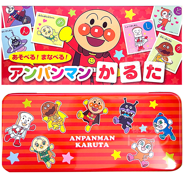 アンパンマンの楽しいかるたです。かるた遊びの他に、絵札を使って色々な遊びをすることが出来ます。また、ひらがなの書き順や、いろいろな言葉、キャラクターの名前を覚える事ができます。アンパンマンデザインのかわいい缶ケース入りで収納にも便利です。