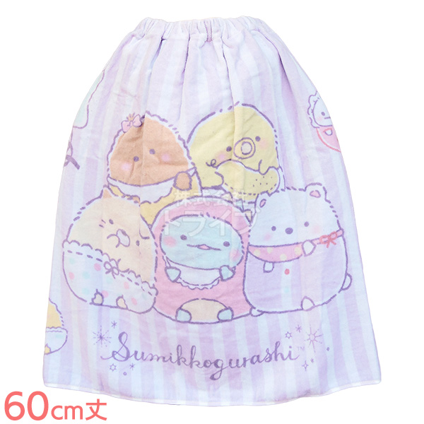 すみっコぐらしのラップタオル(巻きタオル)です。表はシャーリングで滑らかな触り心地、裏は吸収性の良いパイルタオルになっています。授業の水泳・習い事のスイミング・おうちでのお風呂・お出かけなどなど、便利にお使いいただける必須アイテムです!こちらは着丈が60cmのタイプです。幼稚園から小学校低学年におすすめのサイズですが、個人差もありますので、お子様に合ったサイズをお選びください。120cmの子が胸元から巻いて膝下くらいの丈になります。